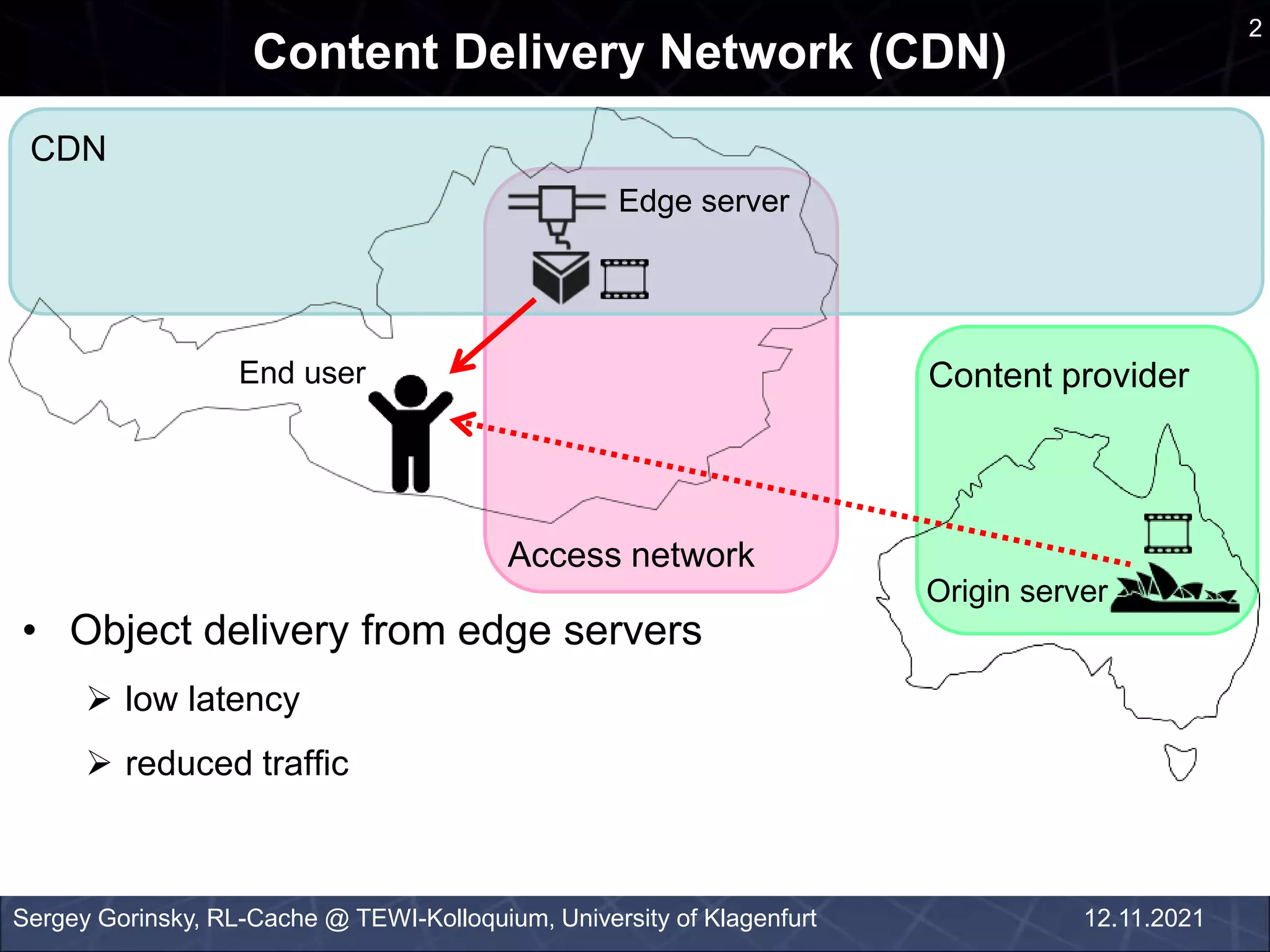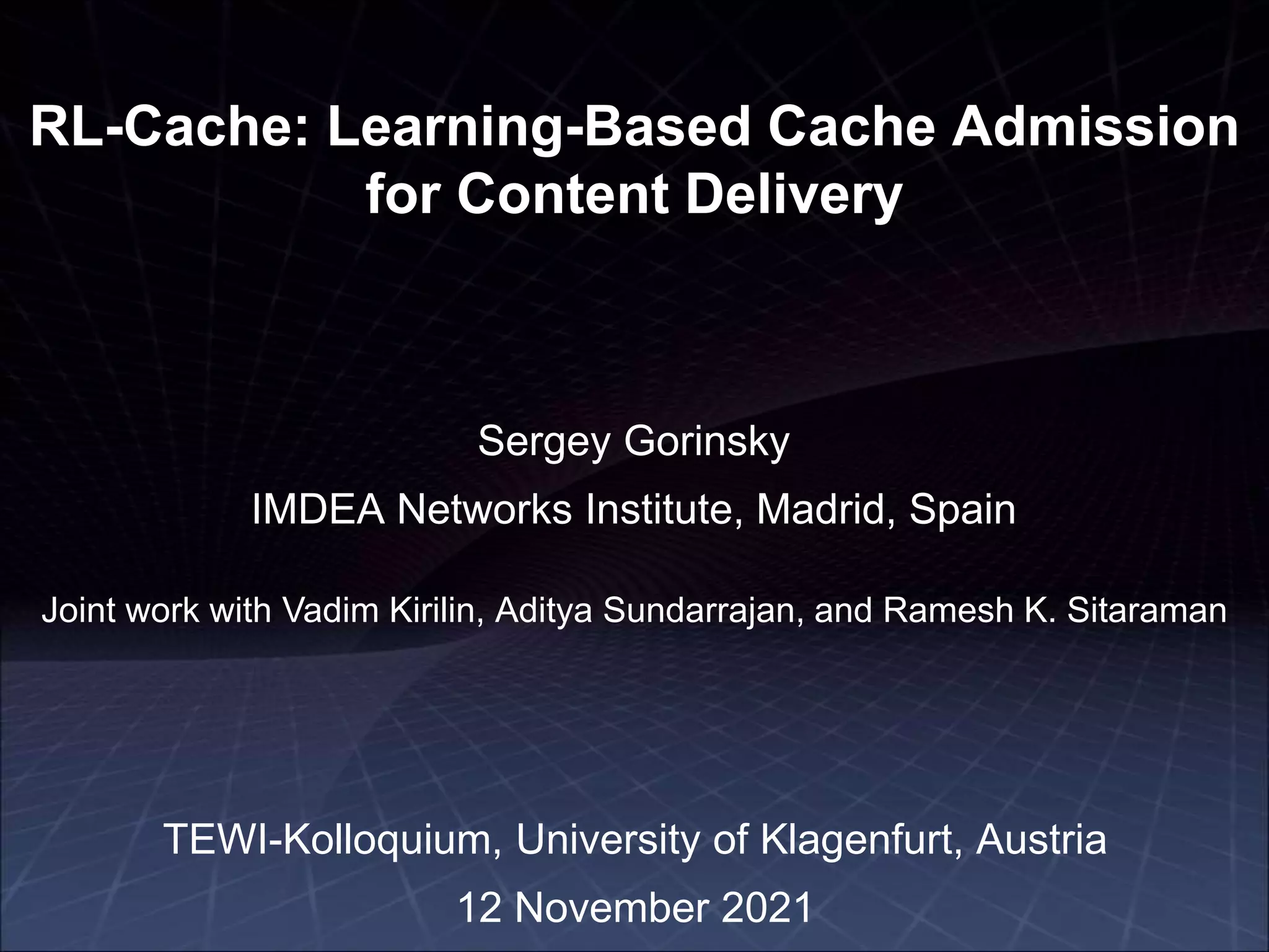 The document presents RL-Cache, a reinforcement learning-based cache admission system for content delivery networks (CDNs) aimed at maximizing cache hit rates in edge servers. It details the challenges of caching, introduces the application of direct policy search for training the model, and illustrates the results from evaluations using real-world CDN data. The findings indicate that RL-Cache can outperform existing caching algorithms and adapt effectively across various traffic classes and cache sizes.