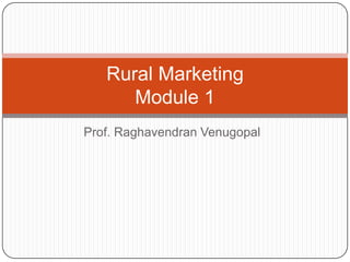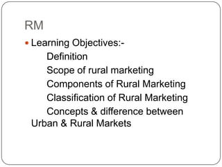 Rural marketing is defined as developing, pricing, promoting, and distributing rural-specific goods and services to satisfy consumer demand and achieve organizational objectives. It involves all aspects of the market structure including pre- and post-harvest operations for farm commodities in rural areas. Rural marketing has evolved over decades from agricultural marketing to marketing of agricultural inputs to current marketing of all products and services to both urban and rural consumers. The rural marketing model involves segmenting the rural market, selecting target markets, developing profiles of segments, defining and prioritizing their needs, developing or modifying the marketing mix, implementing plans, and controlling the process. Rural and urban markets differ in factors like infrastructure availability, income sources, lifestyles, socio-