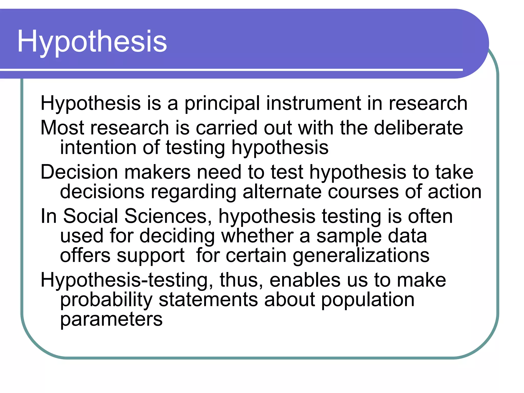 Hypothesis testing is an important tool in research. A hypothesis is a statement or proposition that can be tested through scientific investigation. The null hypothesis represents the default position that there is no relationship between variables or no difference among groups. The alternative hypothesis is what the researcher aims to prove. Through hypothesis testing, researchers aim to reject the null hypothesis by collecting data and calculating the probability of the results if the null hypothesis were true. This probability is then compared to the pre-determined significance level, often 5%, to determine whether to reject or fail to reject the null hypothesis. Proper hypothesis testing involves clearly stating the hypotheses, selecting a random sample, determining the appropriate statistical test based on the data, and interpreting the results.
