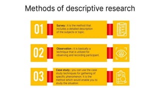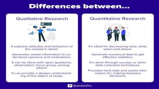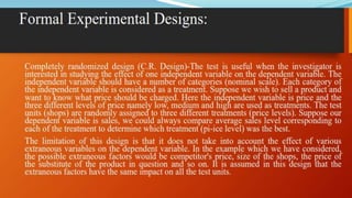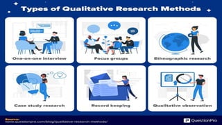 Business research is a process of acquiring detailed information about all areas of business to maximize sales and profits. It helps determine the most profitable or in-demand products and services. Research design provides a framework for efficiently conducting research projects through structured data collection, measurement, and analysis. There are two main types of research design: quantitative, which uses numerical data and statistical analysis, and qualitative, which relies on non-numerical data from sources like interviews and observations. The goal is to draw valid conclusions through high-quality, credible research methods.