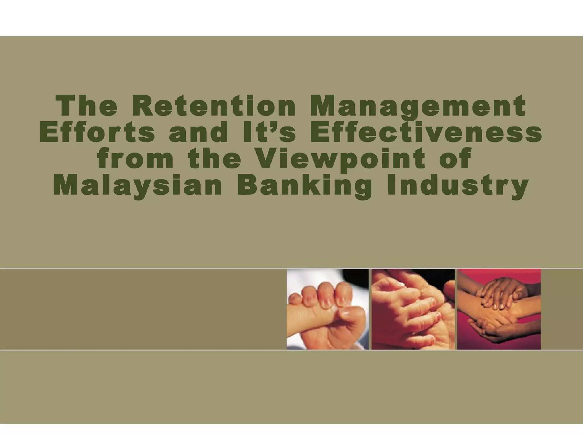 The document discusses retention management efforts in the Malaysian banking industry from the viewpoint of human resource personnel. It aims to understand the retention efforts done by banks, their effectiveness in reducing turnover, and preferred retention strategies. Key findings include that financial benefits and career growth opportunities influence staff retention, while loyalty and pride in the organization are moderate. Banks implement various retention plans but their execution and fair treatment of all staff can be improved. Recommendations include revising employee benefits, investing in training and career development, and gaining management commitment to retention goals.