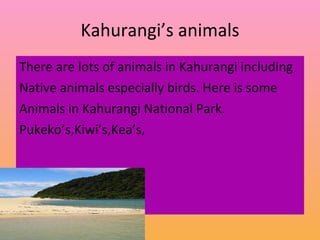 Kahurangi National Park is located in the north west corner of New Zealand's South Island. It is home to many native New Zealand animals, especially birds like pukeko, kiwi, and kea. A national park is a protected area where building is not allowed, and Kahurangi was protected to preserve its natural environment. Parts of the Lord of the Rings films were also shot in locations within Kahurangi National Park.