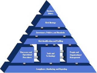 There are two main types of risk: systematic risk which cannot be eliminated through diversification and includes risks like interest rate changes, and unsystematic risk which is specific to individual assets and can be reduced through diversification like employee strikes. Risk comes from various sources including business risk which depends on a company's industry and management, liquidity risk which is an asset's ability to be sold for cash, and market risk which is volatility in stock prices. A strong risk management framework includes identifying and classifying risks, governance with a risk leader, policies and standards, and tools for monitoring risks.