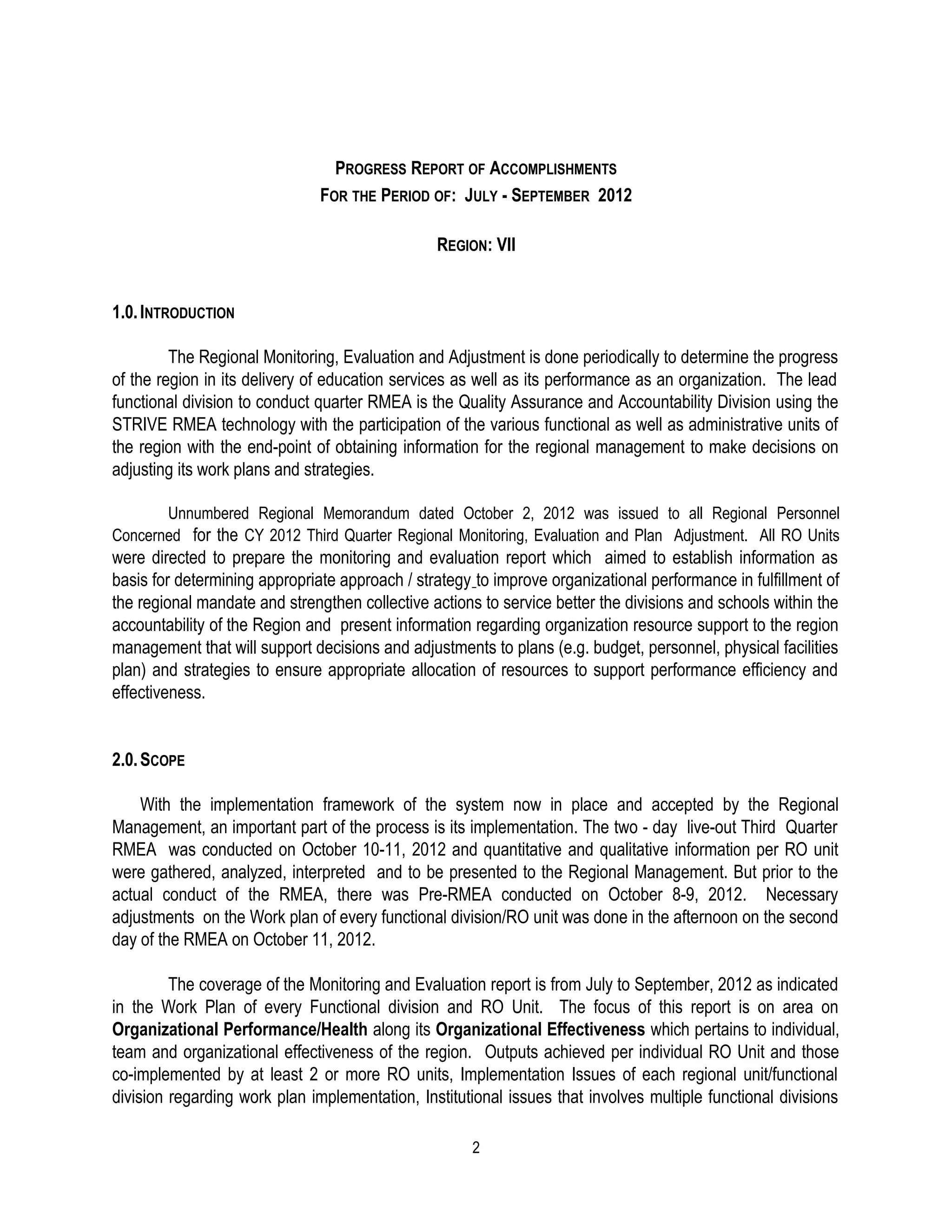 This document provides a progress report for the period of July-September 2012 from Region VII. It finds that the overall accomplishment rate for the region was 88.98%, an increase over the previous quarter. Most divisions met or exceeded their targets, with a few having minor balances to complete in the fourth quarter. Unexpected outputs were delivered by the Curriculum and Learning Management Division due to additional instructions. Recurring issues included lack of sufficient personnel in some divisions and delays in report submission. The report analyzed accomplishments, balances, value-added outputs, issues and lessons learned to guide adjustments to division work plans and resource allocation.