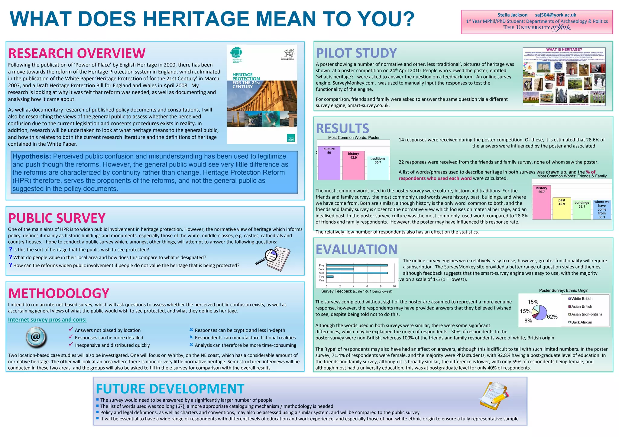 The document discusses a research project examining public perceptions of heritage and the need for reforms to heritage protection in England. It describes the methodology used, including an online survey and case studies. The survey asked people what heritage means to them and what they value protecting. Preliminary results found that responses varied depending on whether people saw an informational poster first. The research aims to better understand if policy definitions of heritage match public definitions to help inform further reforms.