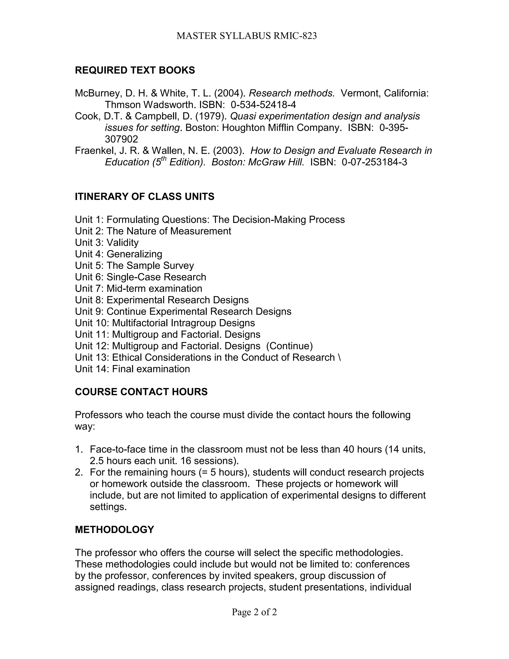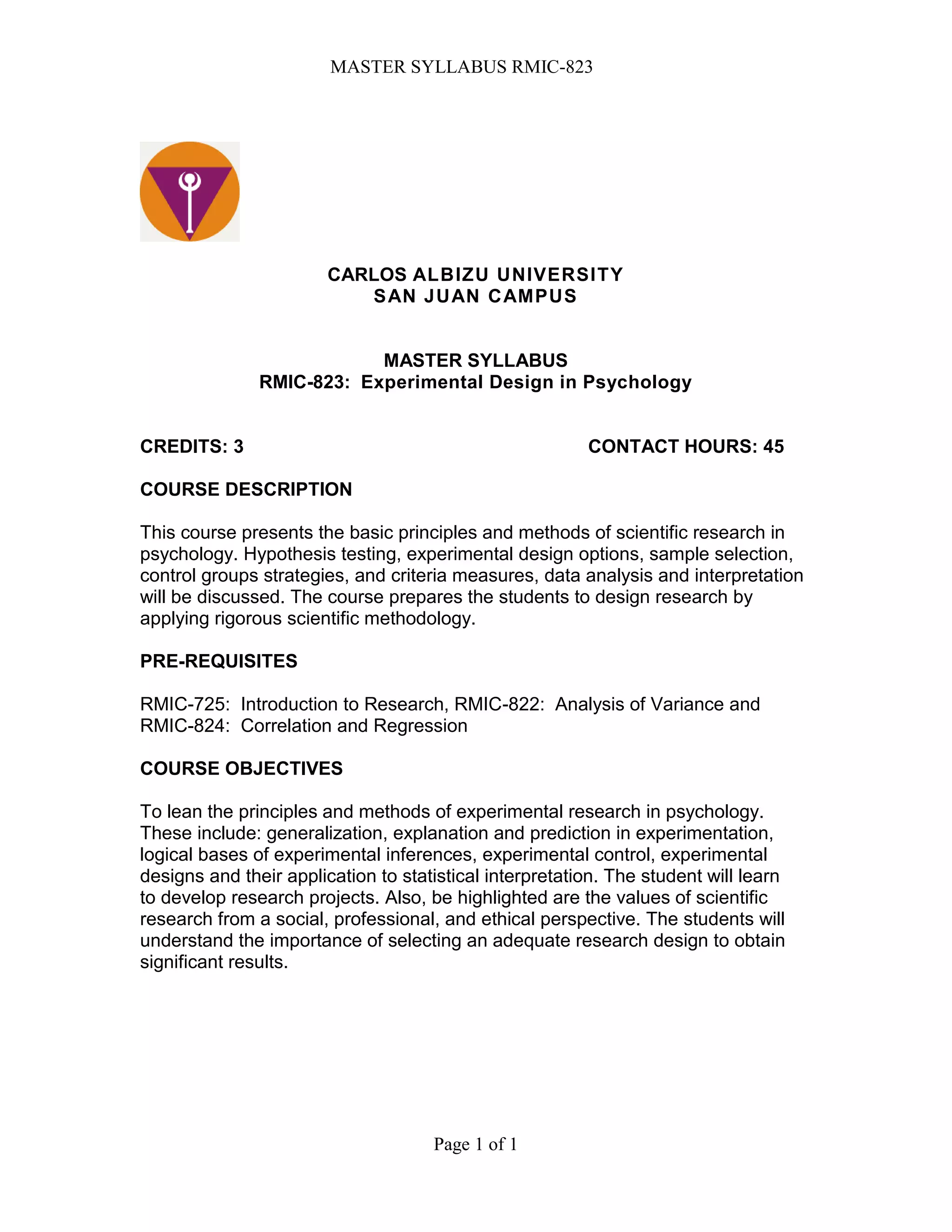 This document provides an overview of an experimental design in psychology course. The course aims to teach students the principles and methods of experimental research, including formulating hypotheses, experimental designs, validity, generalization, and ethics. It covers 14 units over 45 hours of instruction, including both classroom and independent work. Students will learn about research design options, developing research projects, and applying scientific methodology rigorously. Assessment includes papers, projects, exams, and presentations. The course prepares students for competencies in research design, conducting projects, communicating results, and maintaining ethical standards.