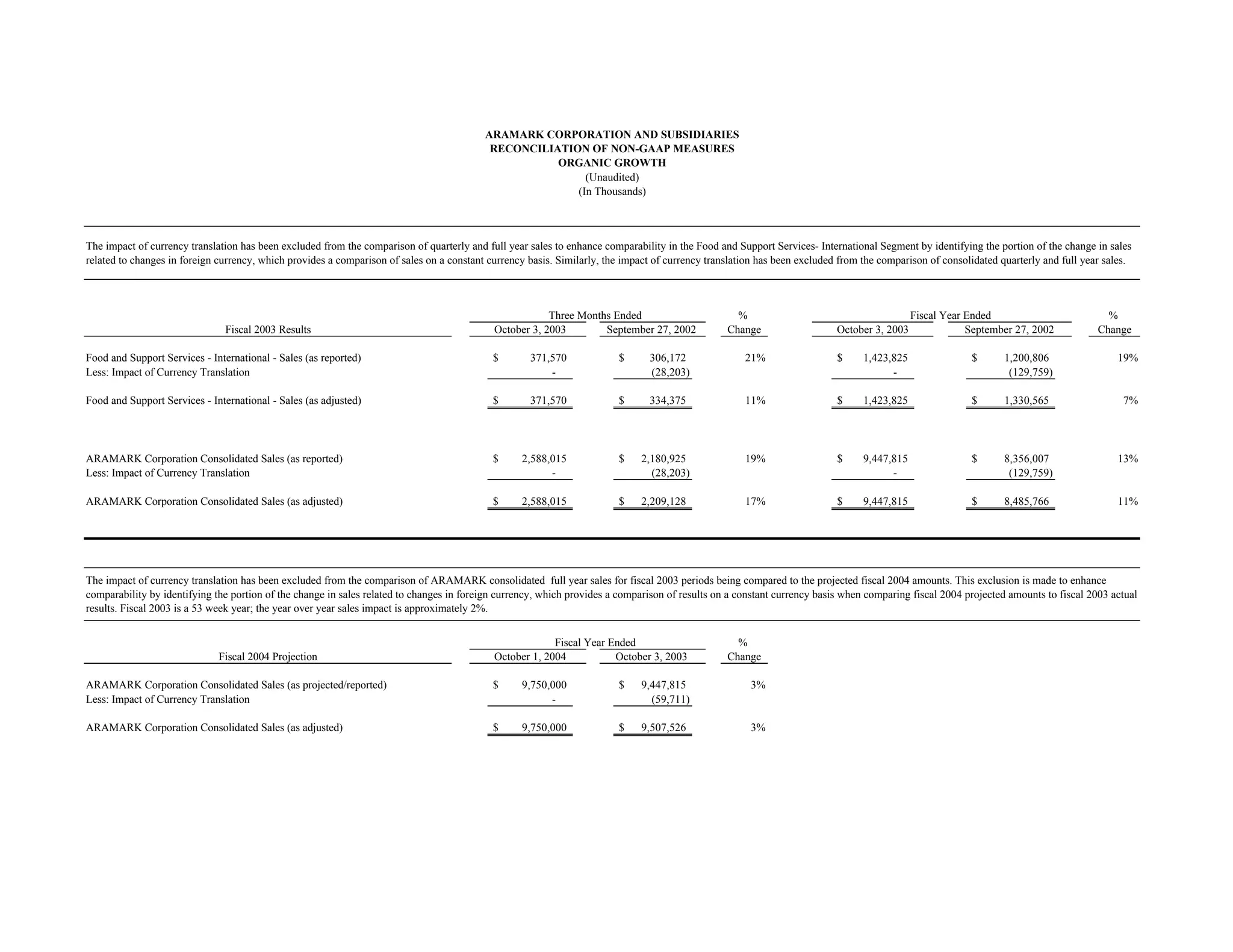 The document provides a reconciliation of non-GAAP measures for organic growth for Aramark Corporation and subsidiaries. It summarizes sales results for the fourth quarter and fiscal year 2003, adjusting for the impact of currency translation to provide a comparison on a constant currency basis. It also provides projected sales for fiscal year 2004 compared to fiscal year 2003 results, adjusting 2003 for currency translation for comparability.