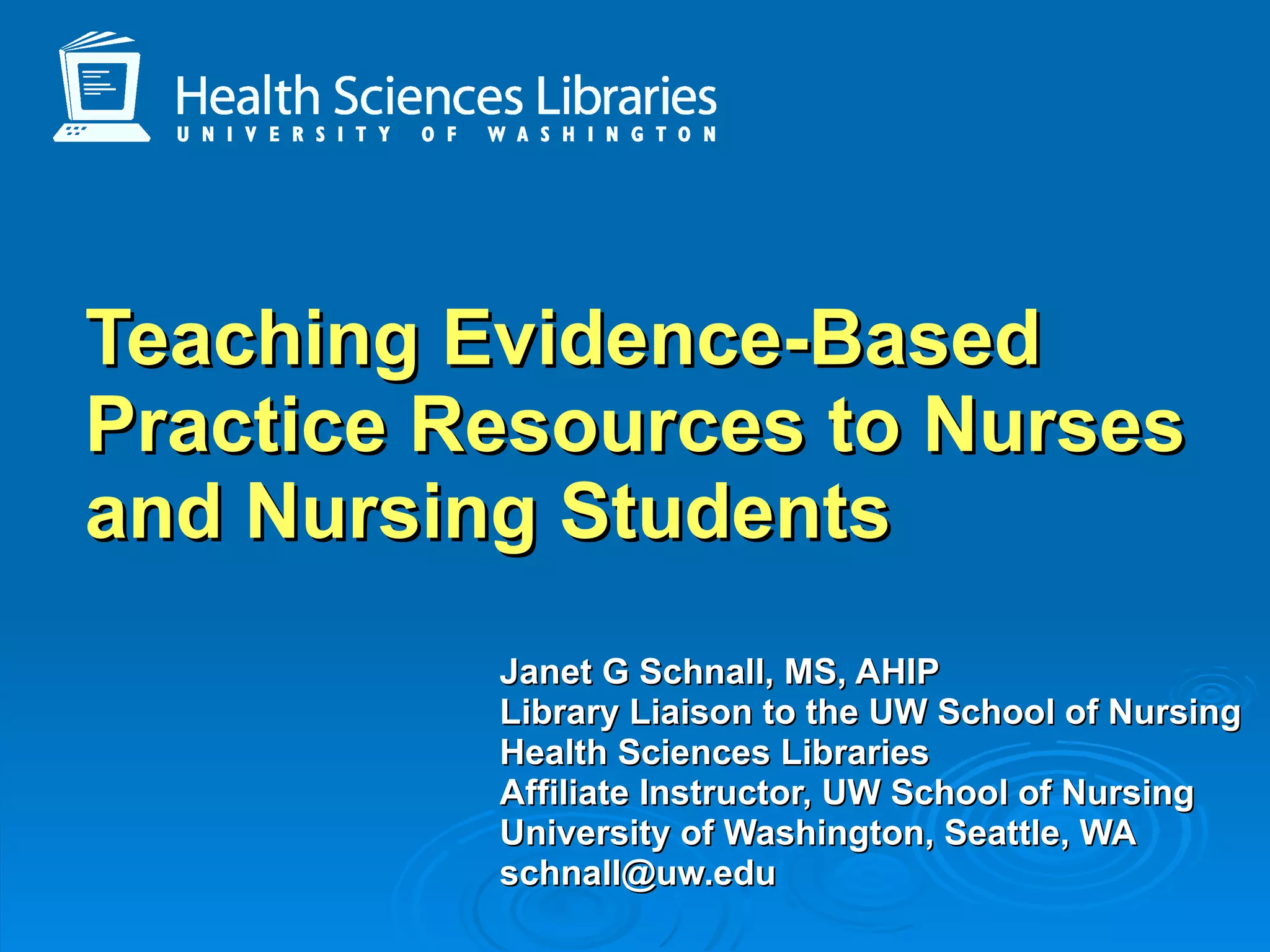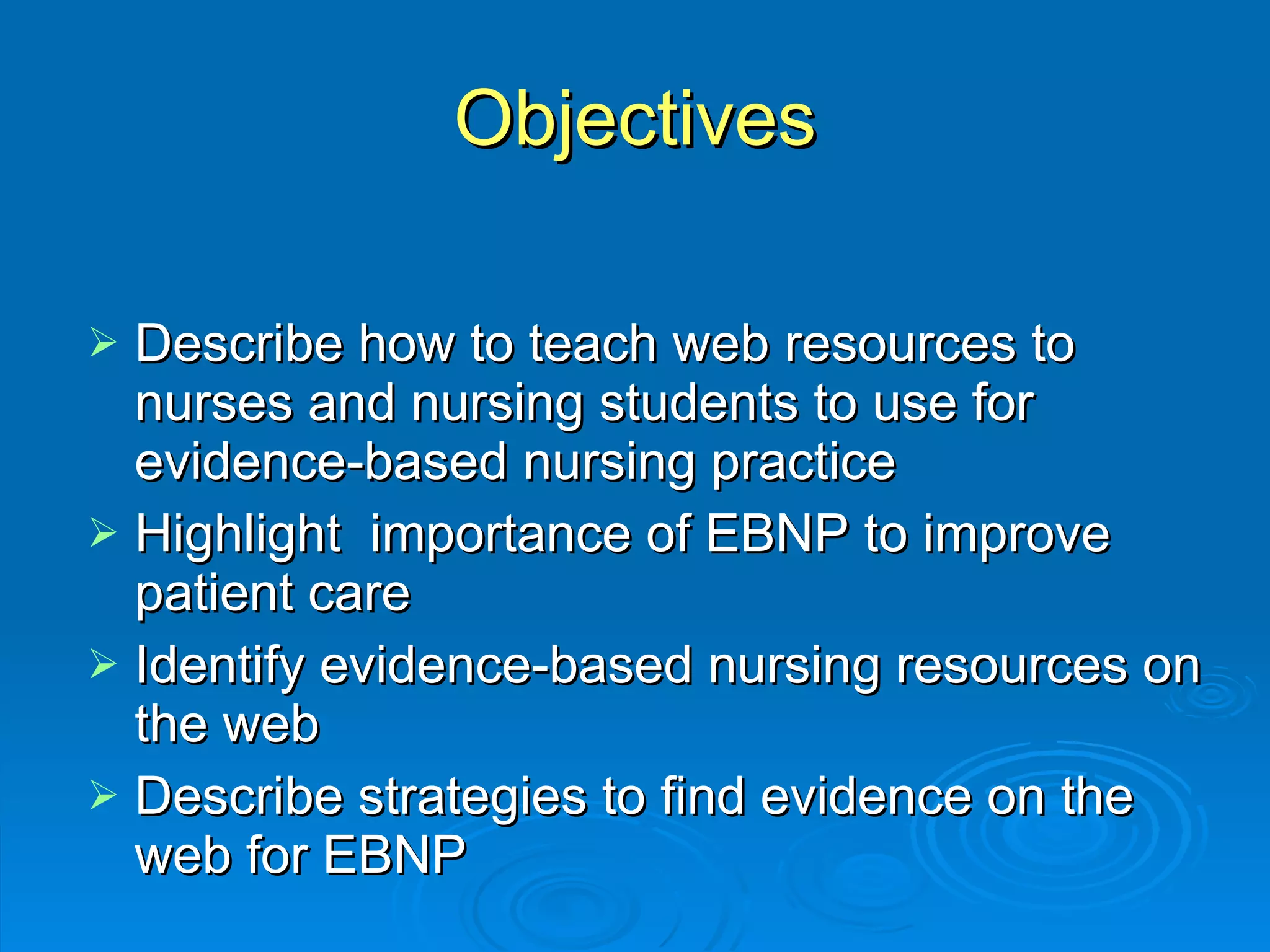 This document provides an overview of teaching evidence-based practice resources to nurses and nursing students. It defines evidence-based nursing practice and describes the importance of using evidence to improve patient care outcomes. Several strategies and resources for finding evidence on the web are highlighted, including searching databases like CINAHL and PubMed, as well as resources like DynaMed, Cochrane reviews, and clinical practice guidelines. Barriers to using evidence-based practice in nursing are also discussed.