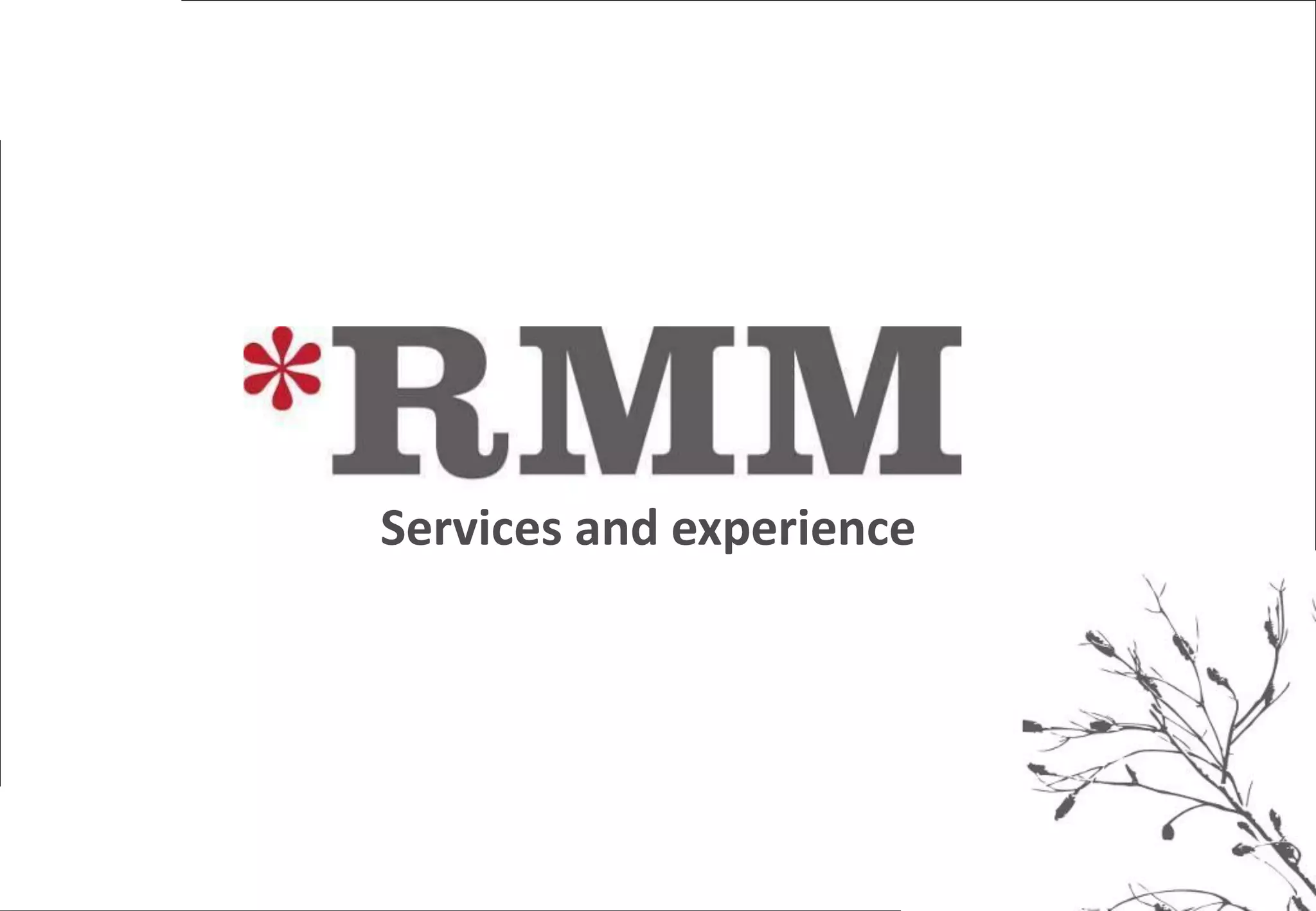RMM is a digital and social media agency that has four main service areas: solution definition, relationship management, content creation, and capability building. They help organizations drive growth and build more profitable customer relationships by creating more connected organizations. RMM works with clients to define solutions, manage relationships, create content, and build internal capabilities in order to help organizations adapt to changing customer needs and disruptive technologies in new ways. RMM is made up of a multi-disciplinary team with experience across various fields including market research, management consulting, creative services, and media planning.