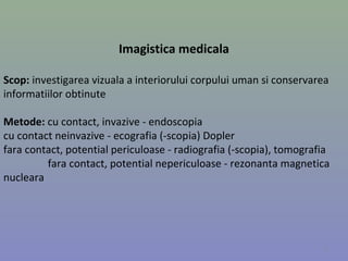 Documentul descrie metodele de imagistică medicală, inclusiv examenul Doppler și rezonanta magnetică nucleară (RMN), utilizate pentru evaluarea stării de sănătate a pacienților. Examenul Doppler este neinvaziv și analizează fluxul sanguin în diverse părți ale corpului, fiind esențial pentru diagnosticul afecțiunilor cardiace și neurologice. RMN, o tehnică avansată de imagistică, oferă imagini detaliate ale structurilor interne, cu aplicații variate în diagnosticarea bolilor sistemului nervos, osteoarticulare și abdominale.