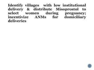 The document outlines key strategies for improving maternal health in India, including using the Mother and Child Tracking System (MCTS) to ensure early registration of pregnancy and full antenatal care, detecting and line listing high-risk pregnancies like severely anemic mothers to ensure management, and equipping delivery points with facilities for basic and comprehensive obstetric and newborn care available 24/7. It also discusses reviews of maternal, perinatal and child deaths to understand gaps in health services and strategies to strengthen health infrastructure for maternal and newborn care.