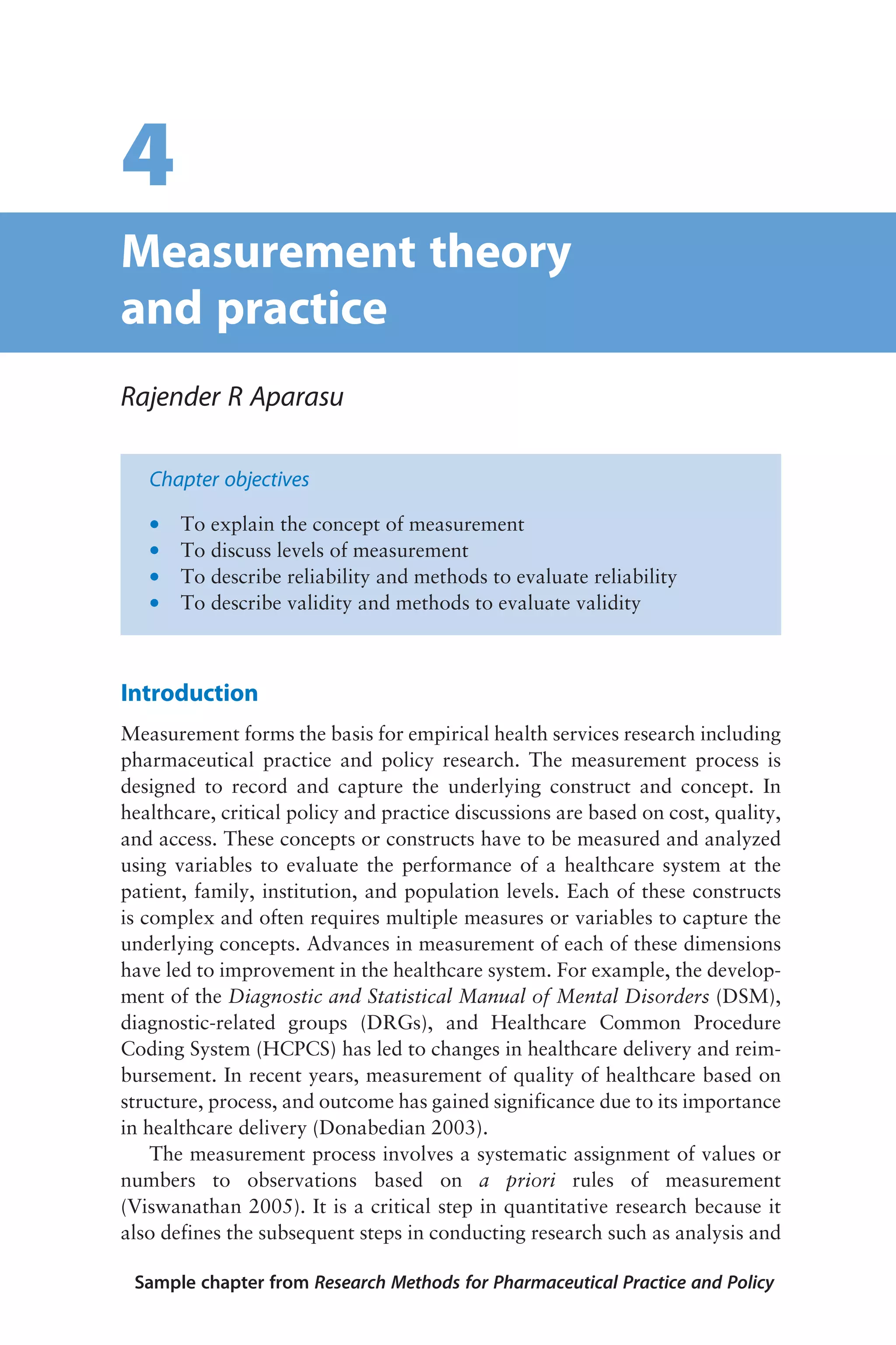 The document discusses measurement theory and practice in health services research. It defines key concepts of measurement including reliability and validity. Reliability ensures consistent measurement and validity ensures the measurement accurately captures the underlying construct. The document describes different levels of measurement from nominal to ratio scales and how they capture variation. It also discusses sources of error in measurement and methods to evaluate reliability and validity, including test-retest reliability and internal consistency.