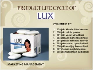 Lux soap was launched in India in 1929 and was one of the first mass-market beauty soaps. It has since gone through different stages of the product life cycle. In the introduction stage, Lux focused on creating awareness in major cities and used early adopters and a film star ambassador. In the growth stage, it expanded distribution and advertising to attract more customers. In maturity, Lux diversified products and defended market share through promotions. Recently, it has faced decline due to competition, economic slowdown, and currency fluctuations, leading Lux to reduce costs and selectively distribute to retain loyal customers.