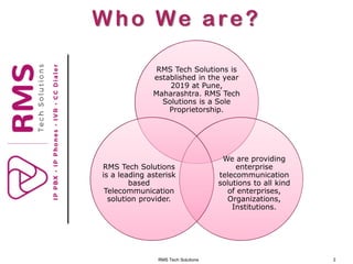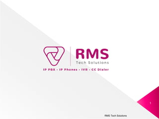 RMS Tech Solutions is an Asterisk-based telecommunications solutions provider established in 2019 in Pune, India. They provide IP PBX systems, call center dialers, gateways, IP phones, voice loggers, PRI cards, and other solutions to SMBs, call centers, hospitals, and other industries. They offer 24/7 support and customizable bundles of extensions and concurrent calls for their solutions.