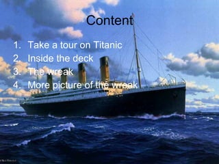 The document provides a tour of the RMS Titanic, including details of its size and features from when it was in service in April 1912. It then describes exploring the wreck of the Titanic using a MIRs underwater vehicle, finding artifacts in well-preserved condition after being underwater for over 80 years, and images of the ship's bow still intact after more than 85 years on the ocean floor. In conclusion, the wreck was found and explored, but the mystery of the Titanic remains an important part of history.