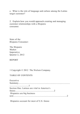 The document discusses the significant and growing influence of the Hispanic consumer market in the U.S., which is becoming essential for business success. It outlines the unique shopping behaviors, values, and cultural ties of Hispanic consumers, emphasizing the need for businesses to tailor their marketing strategies to this demographic. With a projected buying power that places the Hispanic market among the world's largest economies, marketers are urged to engage with this vibrant and sustainable culture to harness future growth.
