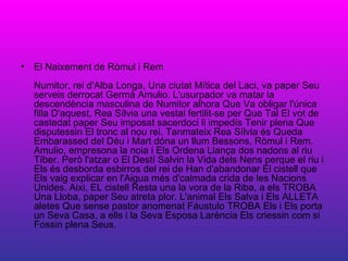El Naixement deRòmul i Rem Numitor, rei d'Alba Longa, Una ciutat Mítica del Laci, va paper Seu serveis derrocat Germà Amulio. L'usurpador va matar la descendència masculina de Numitor alhora Que Va obligar l'única filla D'aquest, Rea Sílvia una vestal fertilit-se per Que Tal El vot de castedat paper Seu imposat sacerdoci li impedís Tenir plena Que disputessin El tronc al nou rei. Tanmateix Rea Sílvia és Queda Embarassed del Déu i Mart dóna un llum Bessons, Ròmul i Rem. Amulio, empresona la noia i Els Ordena Llança dos nadons al riu Tíber. Però l'atzar o El Destí Salvin la Vida dels Nens perque el riu i Els és desborda esbirros del rei de Han d'abandonar El cistell que Els vaig explicar en l'Aigua més d'calmada crida de les Nacions Unides. Aixi, EL cistell Resta una la vora de la Riba, a els TROBA Una Lloba, paper Seu atreta plor. L'animal Els Salva i Els ALLETA aletes Que sense pastor anomenat Fáustulo TROBA Els i Els porta un Seva Casa, a ells i la Seva Esposa Larència Els criessin com si Fossin plena Seus.