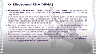 The document discusses RNA synthesis and mRNA processing in eukaryotes. It describes that mRNA processing begins with transcription by RNA polymerase, which adds a 5' methylated cap. Specific sequences in the pre-mRNA are then bound by cleavage factors, moving the 3' end into the correct configuration for cleavage. Poly A polymerase then binds and cleaves the 3' end, synthesizing an adenine tail, with additional proteins binding to increase tail growth until it reaches full length. The processed mRNA is then ready for splicing before translation.