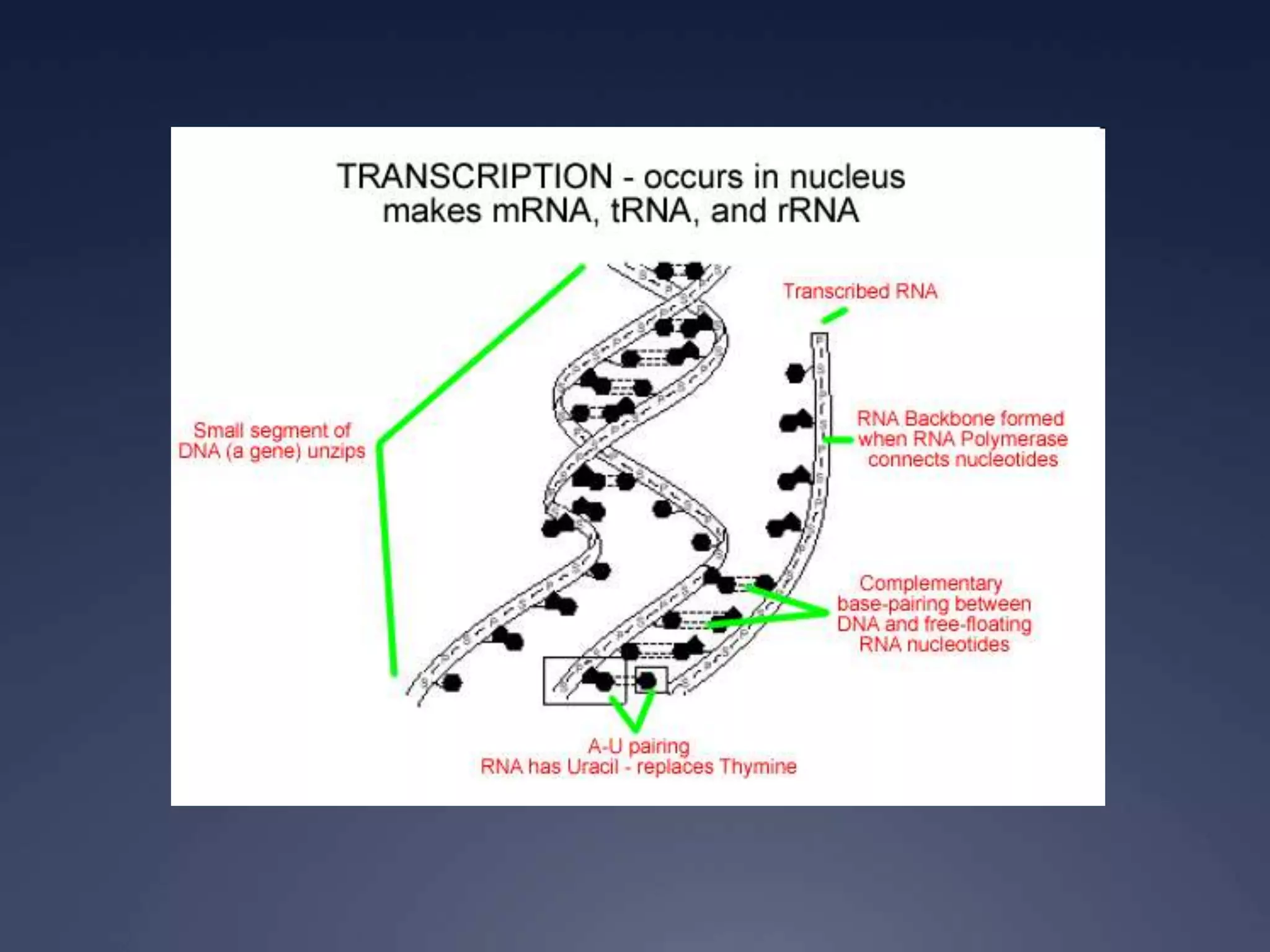 RNA is synthesized from DNA in a process called transcription. It involves three main steps - initiation, elongation, and termination. In initiation, RNA polymerase binds to the promoter region of DNA and separates the strands. In elongation, RNA nucleotides bind to the template DNA strand to form mRNA. In termination, hairpin loops form in the newly synthesized RNA causing transcription to stop. The primary mRNA transcript then undergoes processing where introns are removed and exons are spliced together to form the final mRNA.