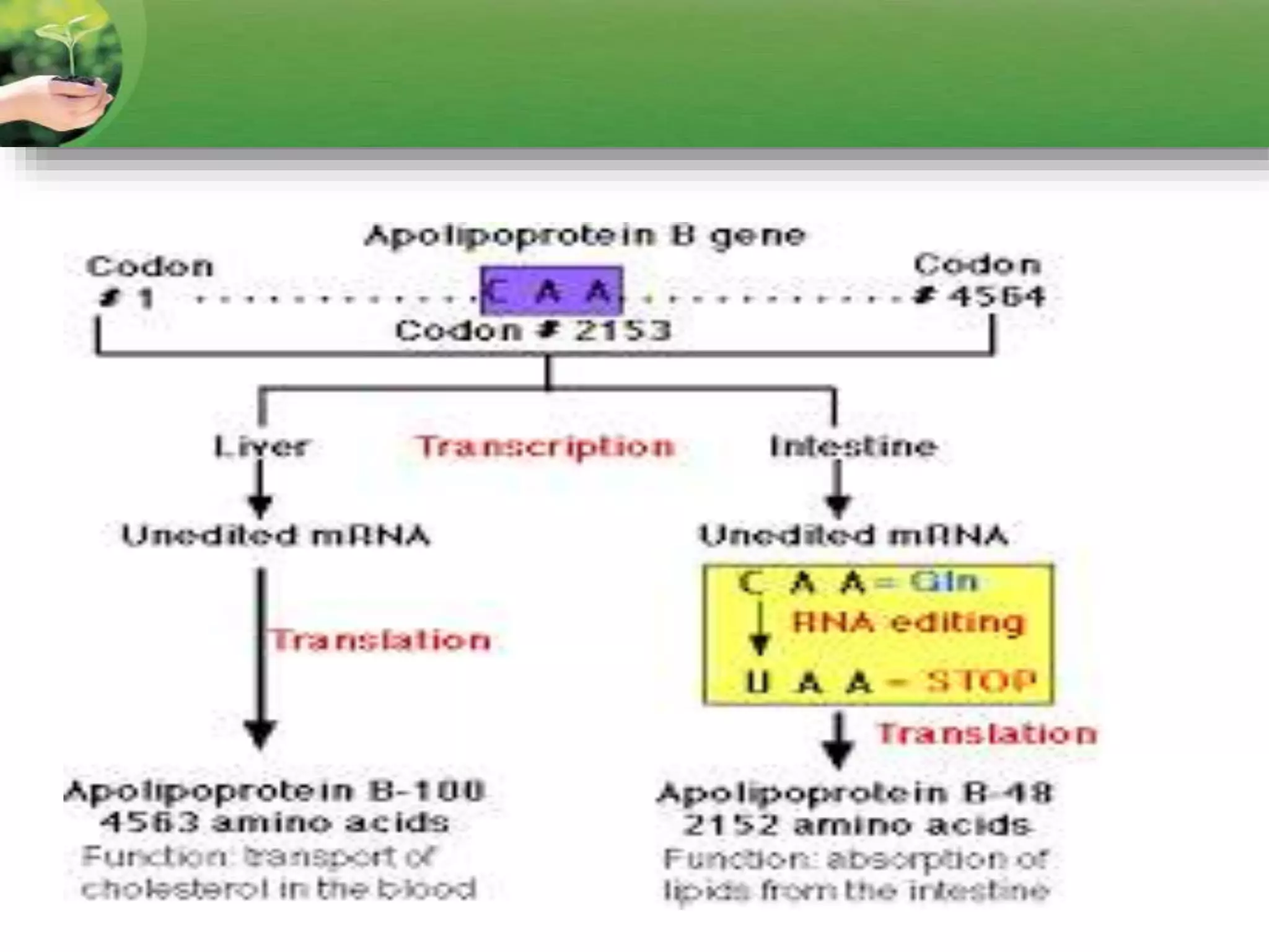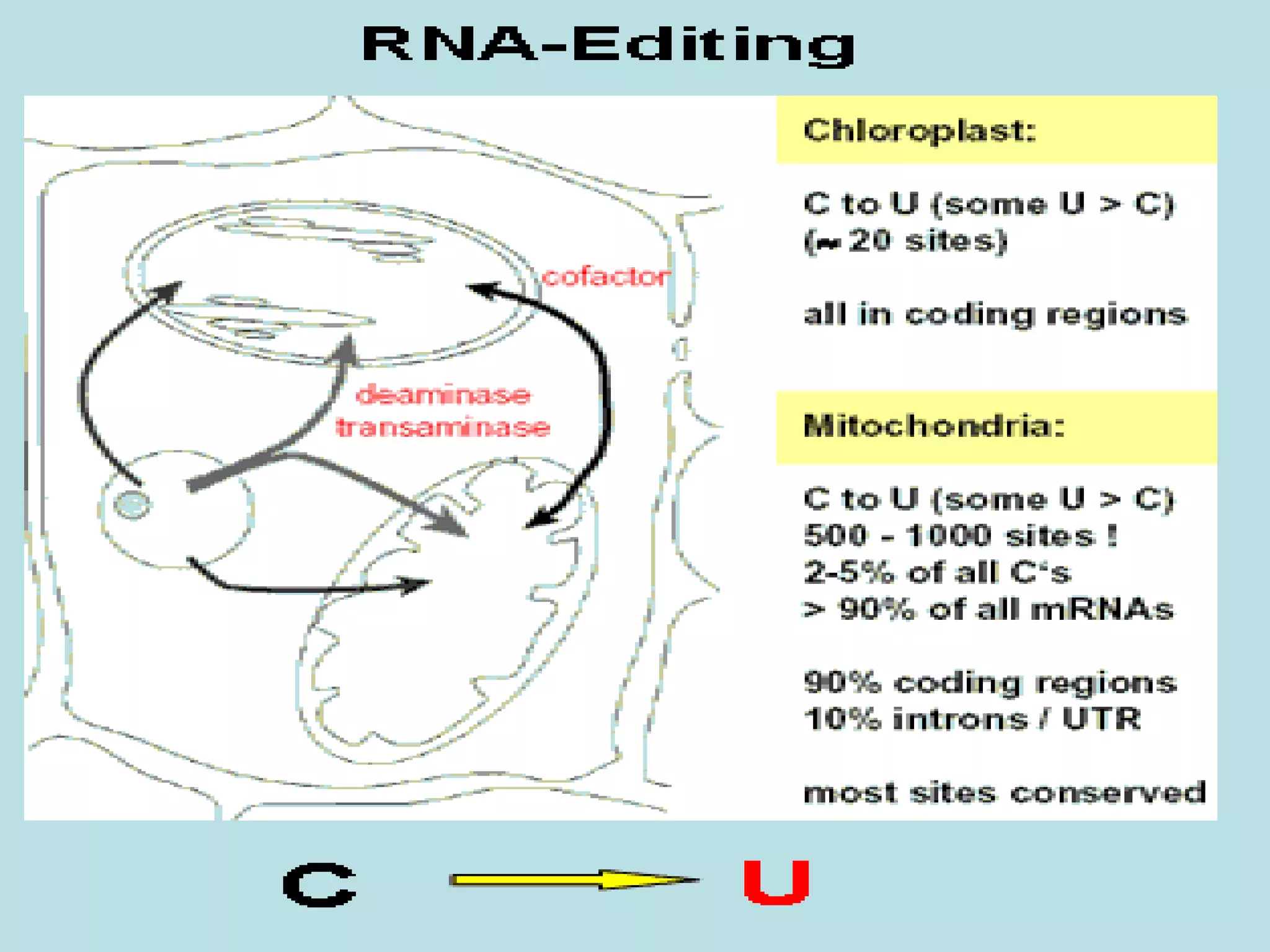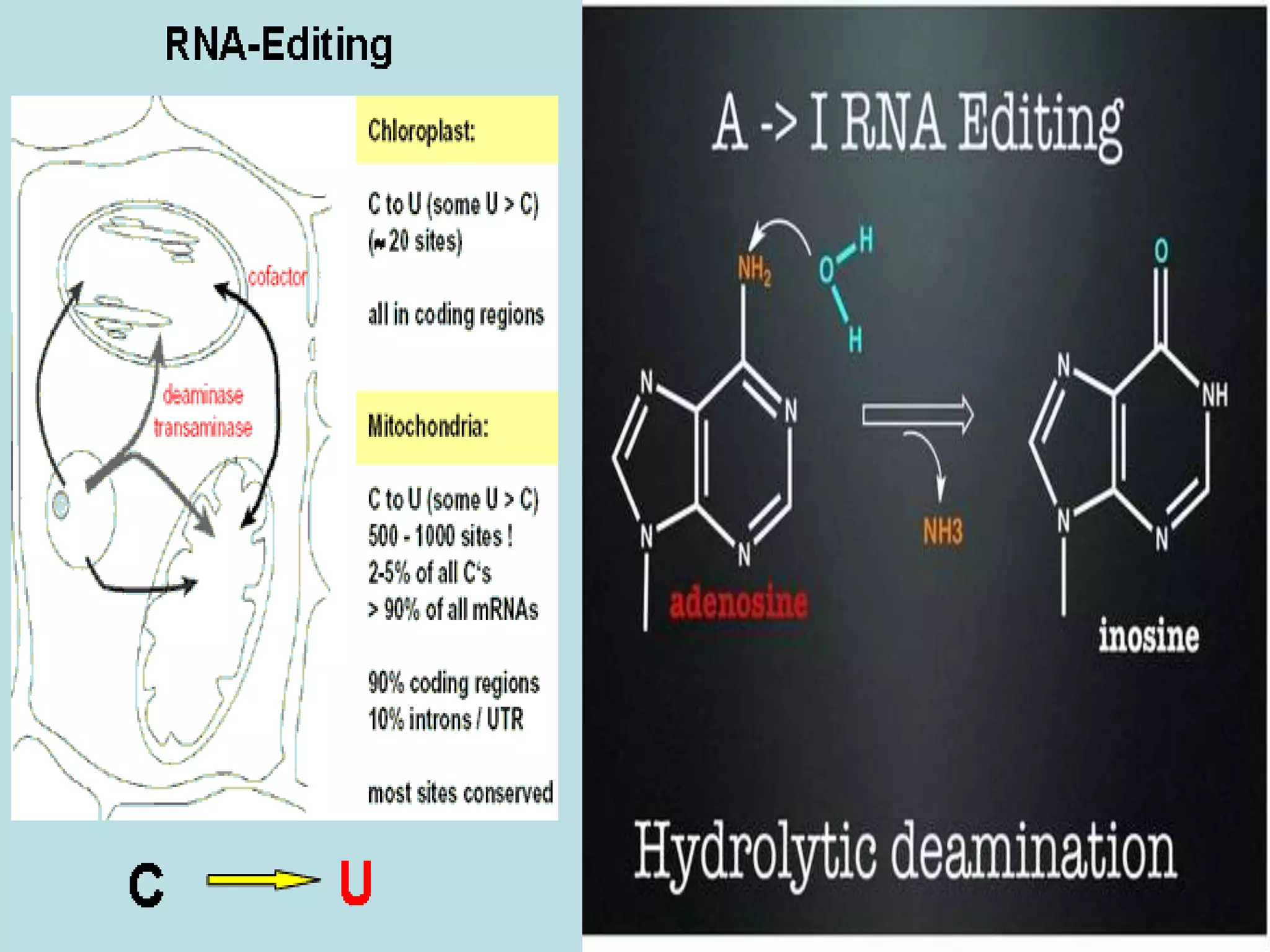 - Two major types of RNA editing are C to U editing, like in the human ApoB gene, and A to I editing which occurs in double-stranded RNA regions and is catalyzed by ADAR enzymes.