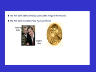 RNA interference (RNAi) is a biological process where RNA molecules inhibit gene expression by destroying mRNA. It was discovered as gene silencing in plants and nematodes. RNAi is triggered by double-stranded RNA being cut into small interfering RNAs that target homologous mRNAs for degradation. This protects against viruses and regulates genes. RNAi has many applications, including modulating HIV replication and treating cancer by silencing viral or other genes. It is a powerful new genetic tool with potential for therapeutics.