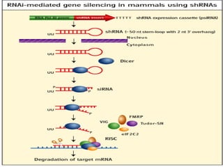 RNA interference is a mechanism by which small RNA molecules like microRNA and siRNA regulate gene expression by binding to mRNA and preventing protein production. This mechanism is important for immunity and controlling gene expression. It was discovered in 1998 by Fire and Mello through experiments in C. elegans showing that double-stranded RNA, but not single stranded, could efficiently silence genes. RNAi has many applications in biotechnology, functional genomics, and medicine.