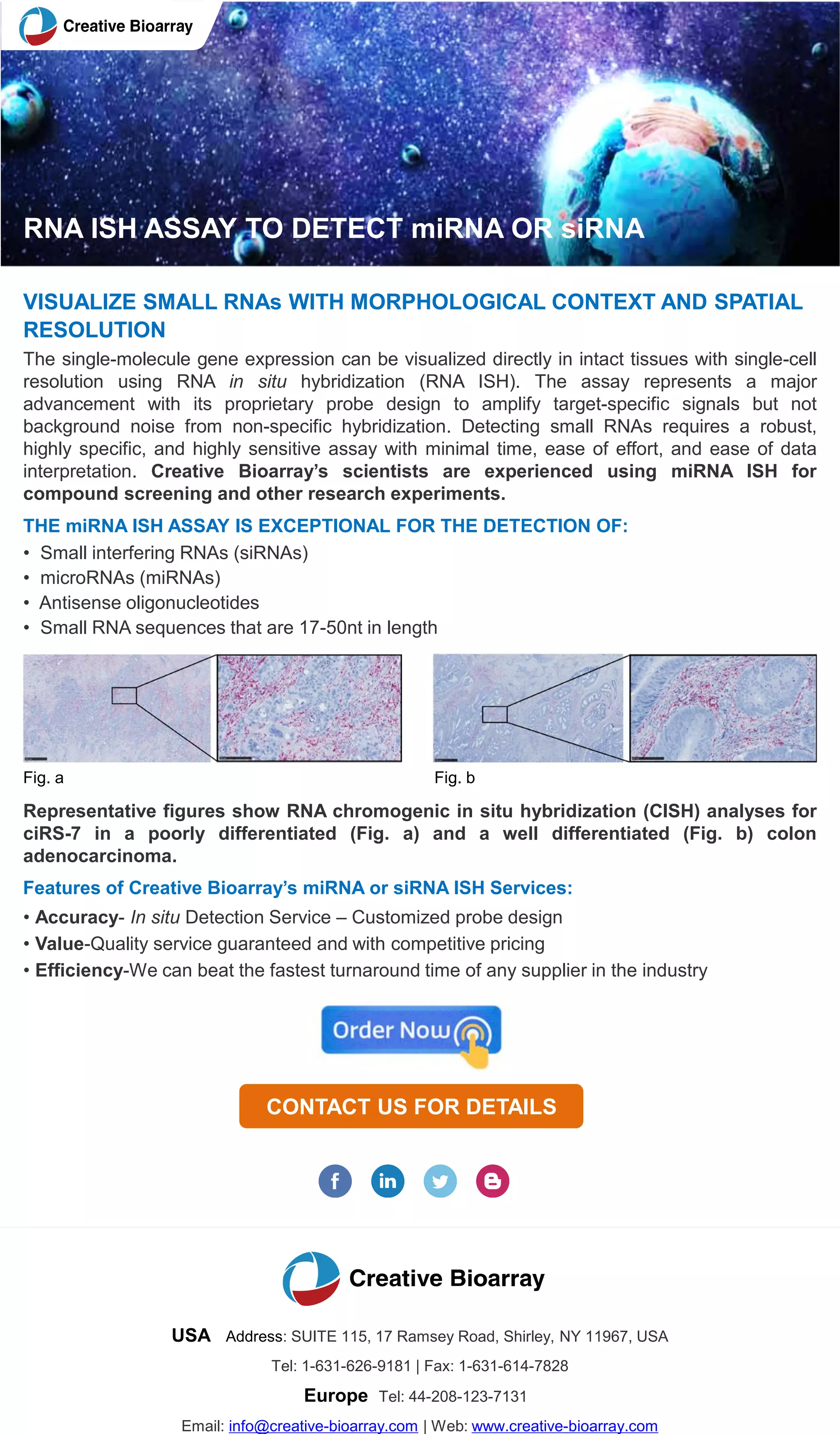 The document details a proprietary RNA in situ hybridization (RNA ISH) assay developed by Creative Bioarray for detecting small RNAs, including miRNAs and siRNAs, in intact tissues at single-cell resolution. This assay offers high specificity and sensitivity, enhanced by customized probe designs, and enables visualization of small RNAs within their morphological context. Creative Bioarray emphasizes their accuracy, value, and fast turnaround times for research services related to RNA detection.