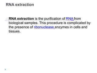 RNA isolation is the purification of RNA from biological samples. It requires strict precautions to avoid degradation by RNases, enzymes that naturally degrade RNA. The TRIzol method uses phenol and chloroform to separate RNA, DNA and proteins during cell lysis and homogenization. Chloroform separates the mixture into aqueous and organic phases, with RNA remaining in the aqueous phase. RNA is then precipitated with isopropanol and washed with ethanol before being re-dissolved in water. RNA concentration and purity is determined spectroscopically. Filter-based and magnetic particle methods provide alternative RNA isolation techniques.