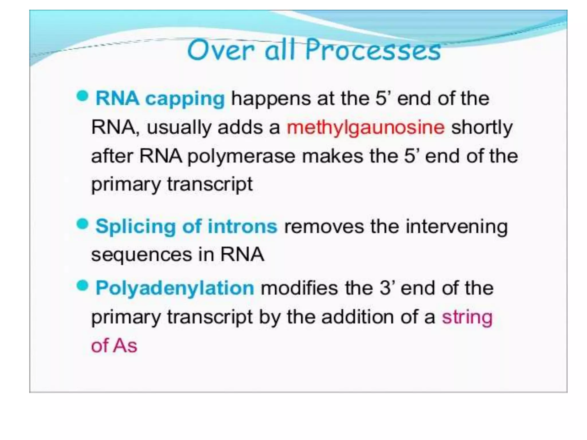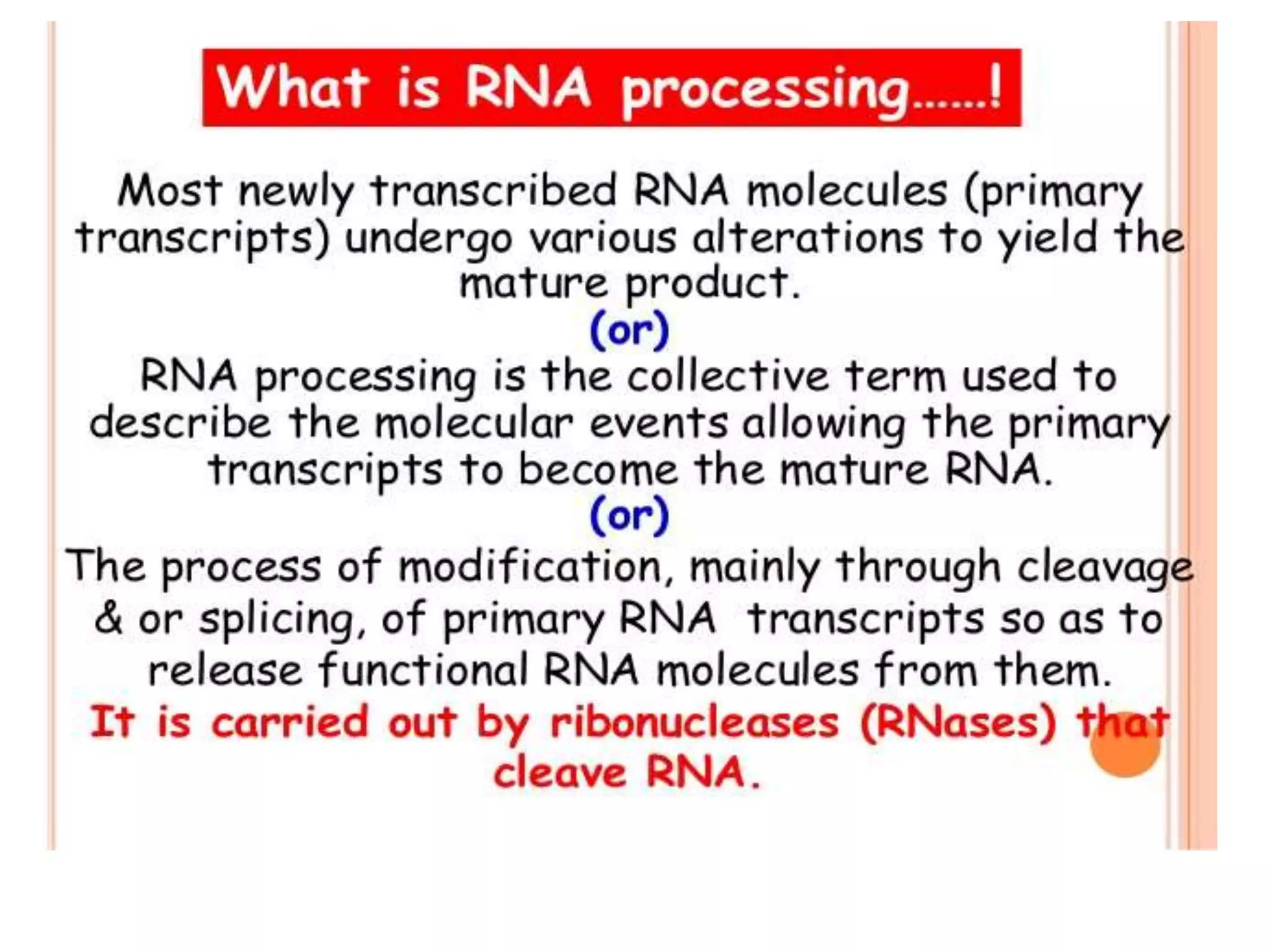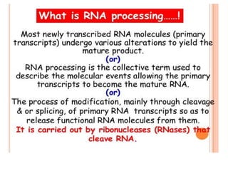 The document presented by Shahzaib Khurshid discusses the necessity of RNA processing in both prokaryotes and eukaryotes. It covers various aspects such as hnrna, snrna, 5' capping, poly A tail addition, and the mechanism of RNA splicing including spliceosome functions. Additionally, it addresses the steps involved in RNA processing and invites questions on the topic.