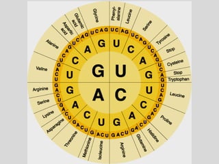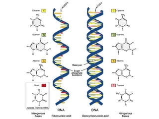 This document summarizes key aspects of RNA and DNA, including that RNA is single-stranded, contains ribose and uracil, and comes in three main types: mRNA, tRNA, and rRNA. It also compares RNA and DNA, noting DNA is double-stranded, contains deoxyribose, and remains in the nucleus, while RNA can leave the nucleus. The document then discusses gene expression and protein synthesis, including the roles of transcription, translation, and messenger RNA carrying codons that determine the amino acid sequence of proteins.