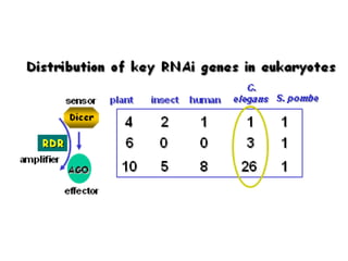 RNA silencing/RNAi involves the knock-down of genes through two types of small RNA molecules, miRNAs and siRNAs, that are involved in post-transcriptional and transcriptional gene silencing as an antiviral mechanism; short double-stranded RNAs are processed by the Dicer enzyme into siRNAs which are incorporated into the RISC complex to guide degradation of homologous mRNA targets; RNAi is an important endogenous gene regulatory mechanism and has applications in gene function analysis, gene therapy, and cancer treatment.
