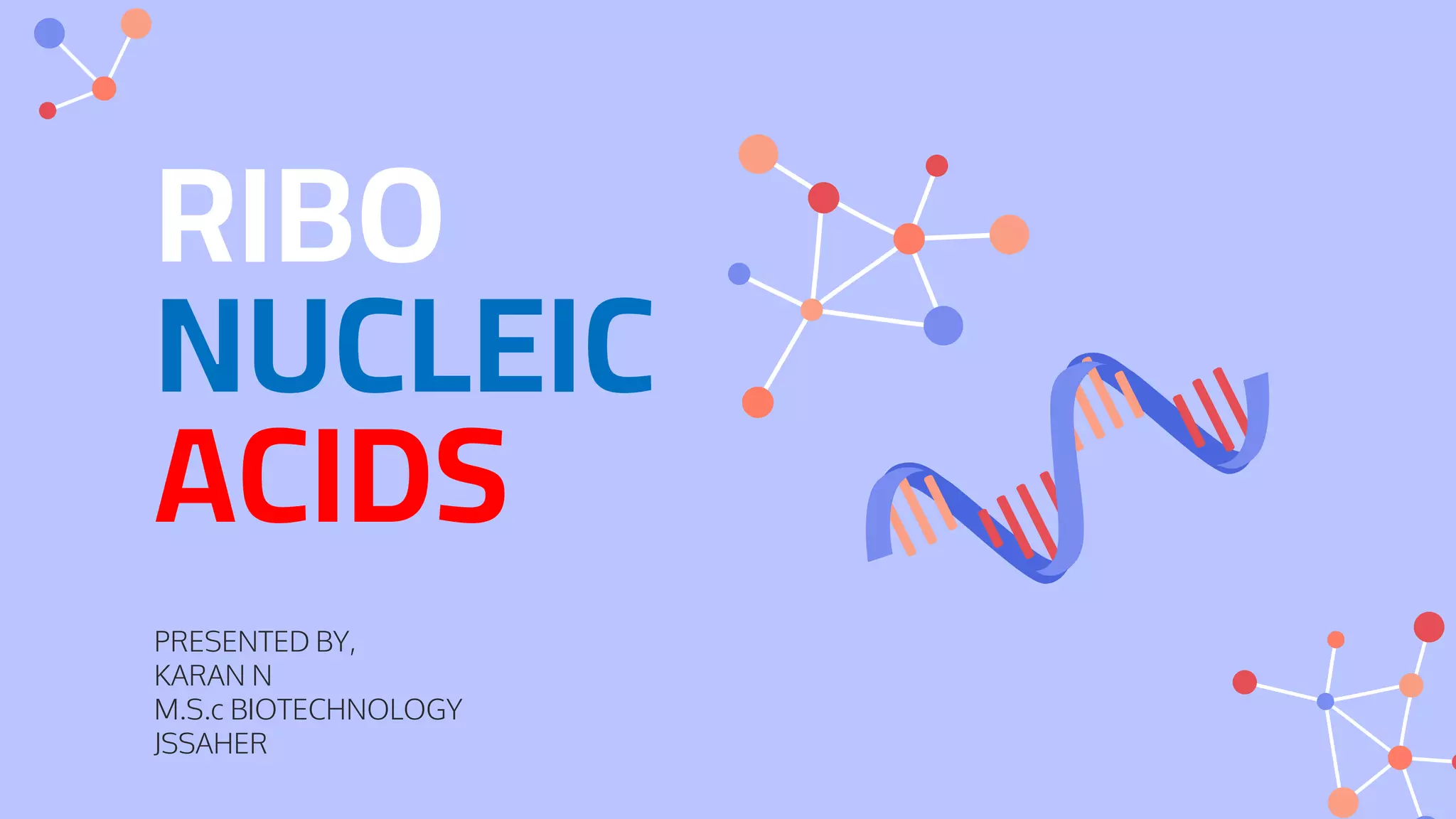 RNA plays important roles in coding, decoding, regulating, and expressing genes. The three main types of RNA are messenger RNA (mRNA), transfer RNA (tRNA), and ribosomal RNA (rRNA). mRNA comprises 5% of cellular RNA and carries coding information from DNA to sites of protein synthesis. tRNA transports amino acids to ribosomes and ensures the correct amino acid is added through complementary base pairing. rRNA makes up 80% of cellular RNA and is a major component of ribosomes, facilitating protein synthesis.