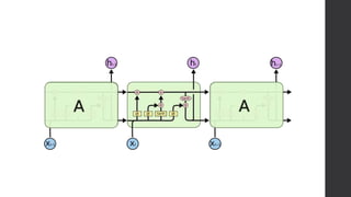 Recurrent neural networks (RNNs) and long short-term memory (LSTM) networks can process sequential data like text and time series data. RNNs have memory and can perform the same task for every element in a sequence, but struggle with long-term dependencies. LSTMs address this issue using memory cells and gates that allow them to learn long-term dependencies. LSTMs have four interacting layers - a forget gate, input gate, cell state, and output gate that allow them to store and access information over long periods of time. RNNs and LSTMs are applied to tasks like language modeling, machine translation, speech recognition, and image caption generation.