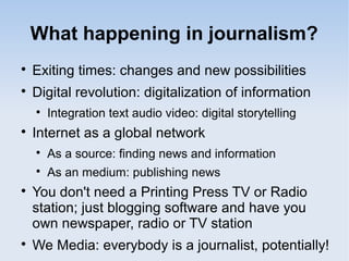 This document outlines a training course on working with Wordpress and digital journalism. It discusses how the digital revolution has changed journalism by allowing anyone to publish news through blogging software and social media. The training will cover setting up blogs, writing blog posts, embedding multimedia like photos and videos, and using social media like Twitter and Facebook to expand an audience. Later sessions will focus on finding and editing photos for blogs and using polls in Wordpress. Mobile phones are also presented as tools for reporting through apps that allow uploading content directly.
