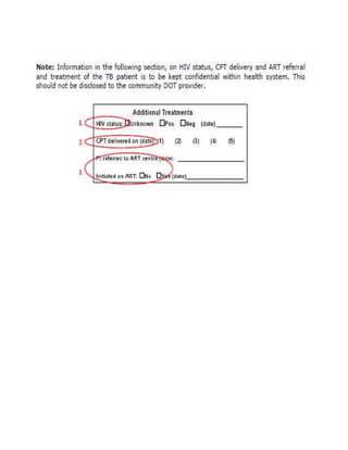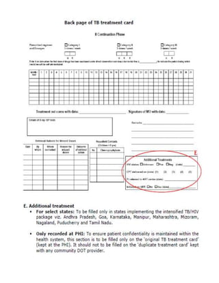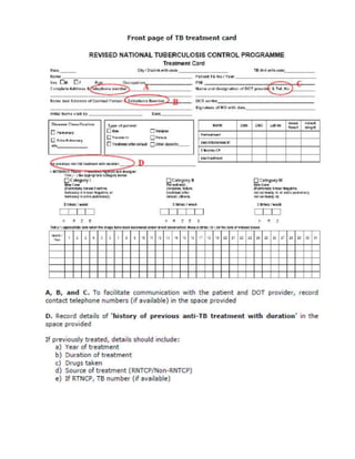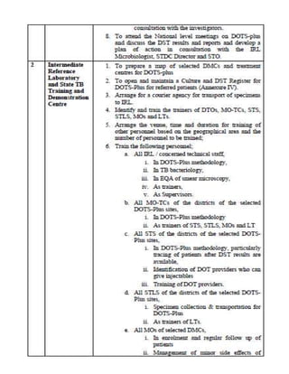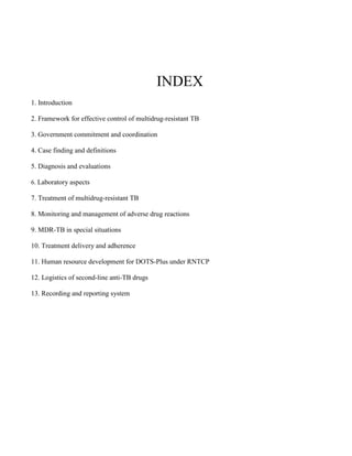 This document provides guidelines for the Revised National Tuberculosis Control Programme (RNTCP) in India to address multidrug-resistant TB (MDR-TB). It outlines a framework for integrating MDR-TB diagnosis, treatment, and management into existing DOTS programs. Key points include establishing quality-assured laboratories for culture and drug susceptibility testing; treating MDR-TB patients according to international guidelines using standardized second-line drug regimens and directly observed therapy; ensuring an uninterrupted supply of quality-assured drugs; and implementing a standardized recording and reporting system. The guidelines aim to make MDR-TB diagnosis and treatment available nationwide by expanding services gradually over time.