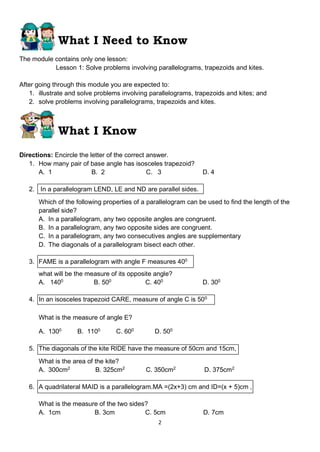 This document contains a mathematics lesson on solving word problems involving parallelograms, trapezoids, and kites. It begins with an introduction to the key properties of parallelograms, trapezoids, and kites. It then provides 4 examples of word problems involving these shapes and shows the step-by-step work and reasoning to solve each problem using the relevant geometric properties. The lesson aims to teach students how to illustrate, set up, and solve word problems involving parallelograms, trapezoids, and kites.