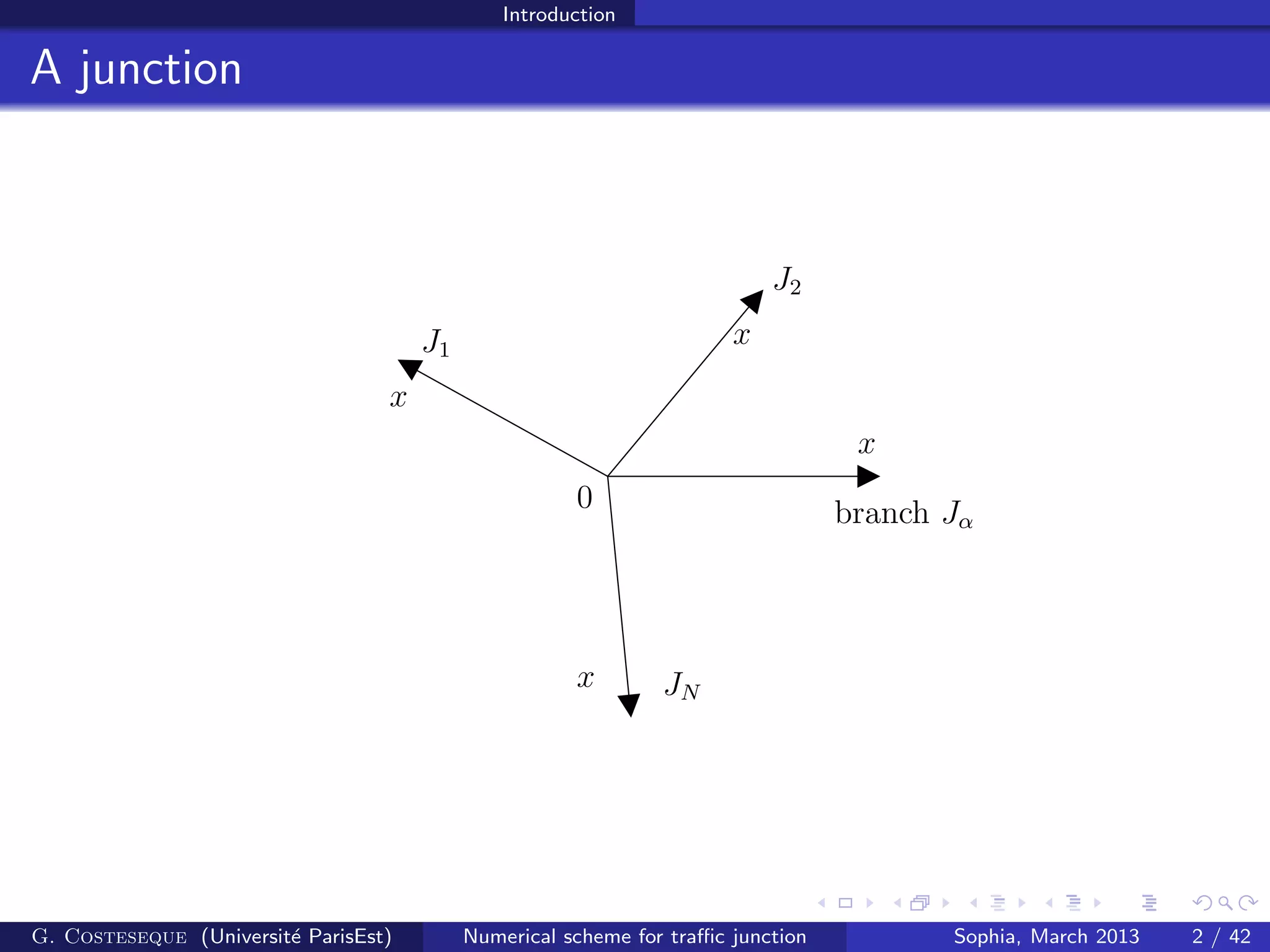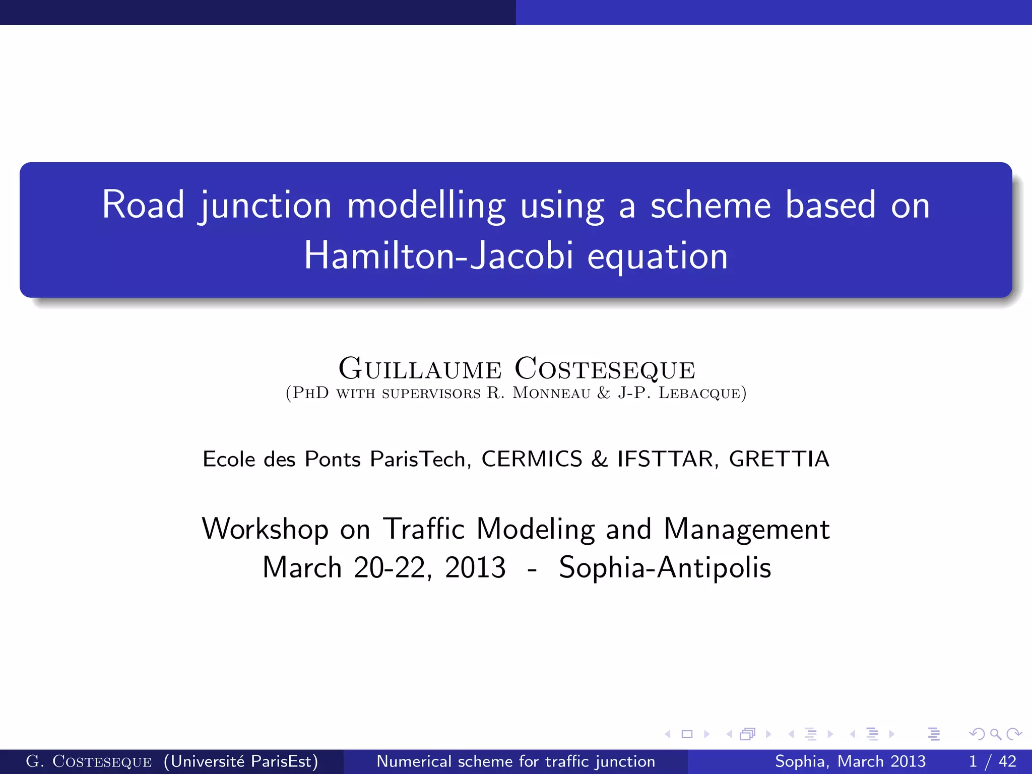 The document summarizes a numerical scheme for modeling traffic flow at road junctions using Hamilton-Jacobi equations. The scheme models traffic on each branch of the junction as well as at the junction point where branches meet. It introduces Hamiltonians representing traffic flow and establishes gradient estimates and existence/uniqueness results for the numerical solution. The scheme is shown to converge to the unique viscosity solution of the underlying partial differential equations as the grid is refined.