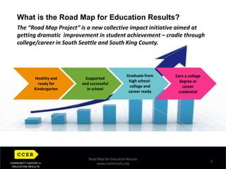 The document outlines a collective impact initiative called the Road Map for Education Results project. The project aims to dramatically improve student achievement from early childhood through postsecondary education in South Seattle and South King County. It focuses on nine communities with large populations of low-income students and students of color. The project brings together organizations to work on early learning, K-12 education, postsecondary attainment, and building community support. The goal is to double the number of students earning a postsecondary credential by 2020 and close achievement gaps.