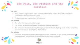 The document discusses finding and using one's voice to inspire and lead others. It begins by outlining the pain of people feeling unfulfilled at work, and proposes the solution is transcending negative mindsets like ego and competitiveness. It then discusses discovering one's voice through gifts like free will and different types of intelligence. Expressing one's voice involves developing energy into vision, discipline, passion and conscience. The leadership challenge is enabling people to realize their potential by contributing their talents and passion. Leaders must model the four intelligences and empower others while holding them accountable. The document emphasizes the importance of trustworthiness, communication, and blending voices to find third alternatives. It discusses pathfinding a shared vision and executing through alignment,