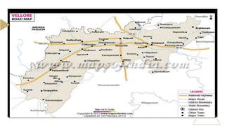 This document summarizes elevation measurements between various points in and around Vellore, Tamil Nadu, India. It finds that the elevation difference between Katpadi and Arcot is 42.57 meters, between Melvisharam and Arcot is 39.88 meters, and between NH234 and Perumugai is 6 meters. Residents in Vellore are calling for improvements to road infrastructure like constructing new overpasses and widening existing roads to address traffic issues. The Chancellor of Vellore Institute of Technology has urged building a new overpass in Katpadi to ease congestion at the railway station junction. A study found that two and three-wheelers make up 76% of morning traffic at the busy Ch