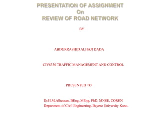 The document discusses road networks, including their functions and components. It reviews literature on road network concepts and Vision 2040, which outlines expectations for reliable, environmentally-friendly, and accessible road infrastructure. The document also examines road network operations, traffic management, and the role of road networks in social and economic development.