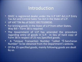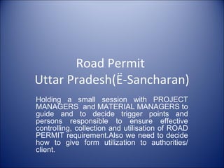 This document provides guidance on obtaining and using road permits, called e-Sancharan numbers, for transporting goods within the state of Uttar Pradesh, India. It outlines the process for vendors to generate e-Sancharan numbers online using commodity information, then issues them to drivers for valid transportation of goods during the permit period. It also discusses procedures for ISGEC to coordinate with clients to obtain permits for billable and non-billable items, and how to request permits directly from taxation authorities if clients deny issuing them. Any questions about the process should be submitted in writing by July 20th.