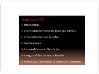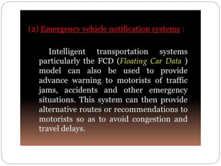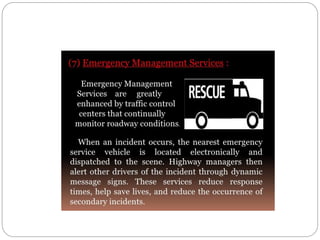 Traffic incident management involves planning, response, safety, and recovery regarding road incidents. It prioritizes safety, traffic mobility, and damage control while detailing incident types, impacts, and management processes. The advancement of Intelligent Transportation Systems (ITS) integrates technology for improved communication and safety in managing transportation infrastructure amid increasing risks from both natural and man-made disasters.