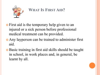 First aid is temporary assistance given to an injured or sick person before professional medical help arrives. Anyone can be trained to administer basic first aid. It is important to receive first aid training so that one can help save lives by providing immediate care, relieve pain, and prevent injuries from worsening until medical assistance arrives. Road accidents are a major cause of injury and death in India, with over 100,000 fatalities annually due to poor infrastructure and unsafe driving habits. Knowing first aid is critical to help reduce accidents fatalities by stabilizing victims and providing emergency treatment until emergency services can take over.