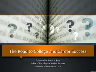 The document provides guidance on choosing a career and college path. It recommends starting with a self-assessment to determine interests, talents, abilities, and values to help identify potential careers. Students should research careers online, connect with people in fields of interest, and gain hands-on experience through courses, volunteer work or internships. When choosing a college, students should evaluate options like size, cost, programs offered, and location to find the best fit for their goals. Having a degree generally leads to higher earning potential and lower unemployment than only a high school diploma. The document encourages patience and flexibility in the career planning process.