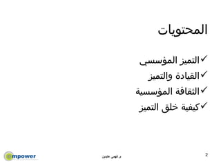 يتناول المستند موضوع التميز المؤسسي ودور القادة في تحقيقه، من خلال تطبيقات متفوقة تهدف إلى إدارة أنشطة المؤسسة وتحقيق نتائج إيجابية. يبرز أهمية القيادة المتميزة والثقافة المؤسسية في تعزيز الأداء العالي والابتكار. يشدد على أن التميز يبدأ من القمة وأن رؤية القائد يجب أن تكون أكبر من حياته الخاصة.