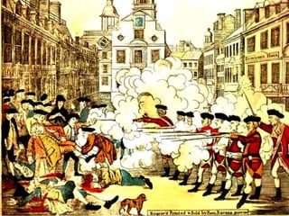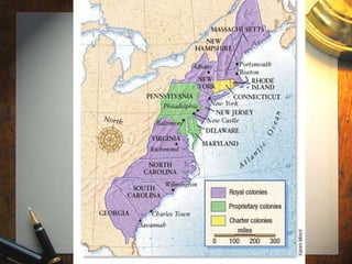 The document summarizes the political origins and ideas that influenced American colonists and their growing tensions with British rule. It discusses documents like the Magna Carta, Petition of Right, and English Bill of Rights that inspired colonial beliefs in limited and representative government. The colonies were established for reasons like religion, trade, and as debtors' prisons. Tensions rose as Britain imposed taxes to pay war debts and limited colonial self-governance, without representation in Parliament. Major events like the Boston Massacre, boycotts, and Boston Tea Party protested "taxation without representation" and grew colonial resistance to unchecked British power.