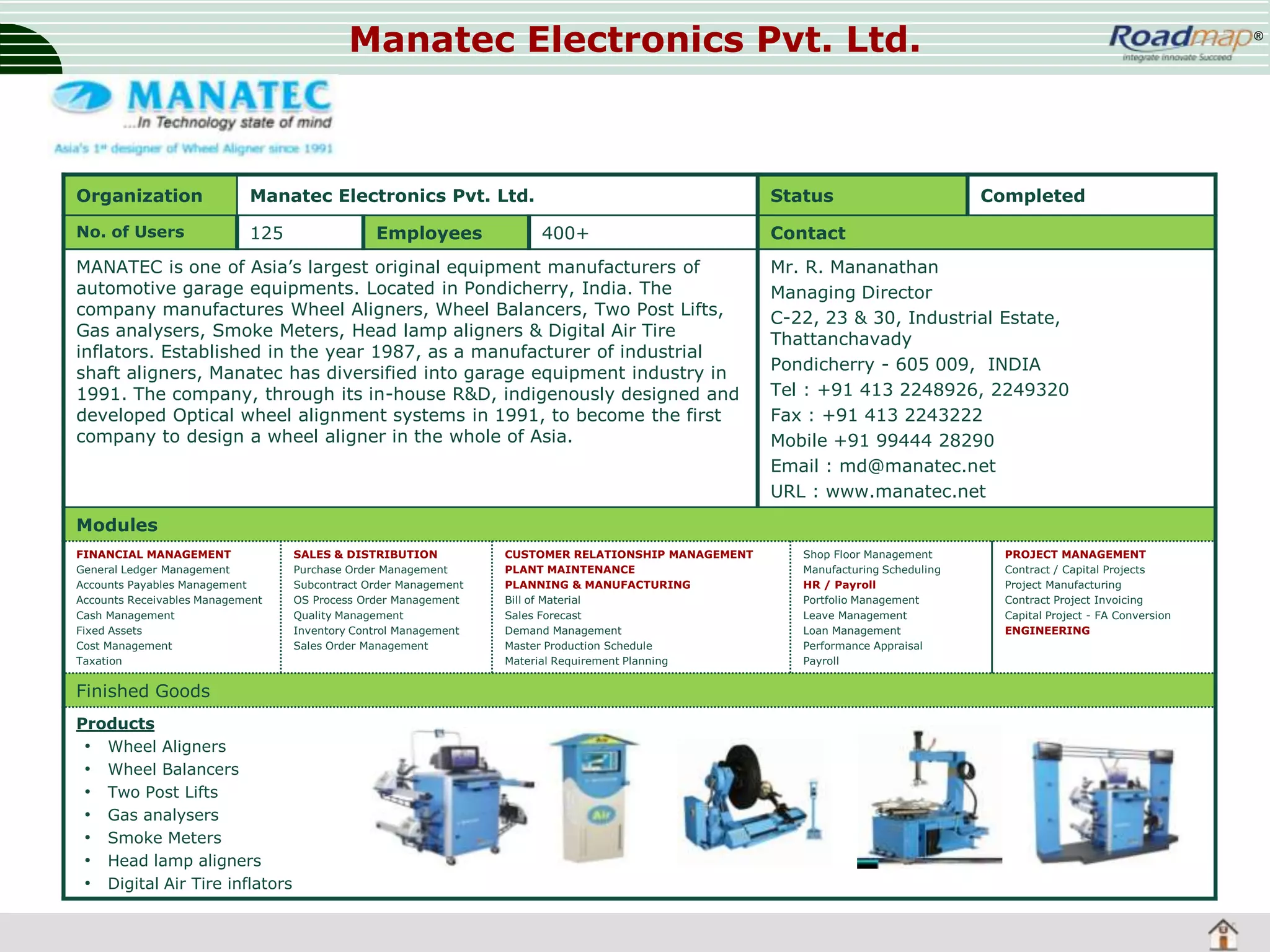 Manatec Electronics Pvt. Ltd. is one of Asia's largest manufacturers of automotive garage equipment located in Pondicherry, India. It employs over 400 people and manufactures wheel aligners, wheel balancers, two post lifts, and other equipment. Established in 1987 manufacturing industrial shaft aligners, in 1991 Manatec diversified into the garage equipment industry and was the first Asian company to design an optical wheel alignment system.