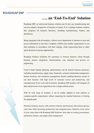 Roadmap ERP is an end-to-end business solution that can integrate all functions of a business including manufacturing, finance, distribution, and more. It allows for real-time access and visibility across departments. Roadmap ERP is designed to increase business values through process integration, transformation, cost reduction and process re-engineering. The system can be customized to meet industry or company-specific needs without limiting upgrades.
