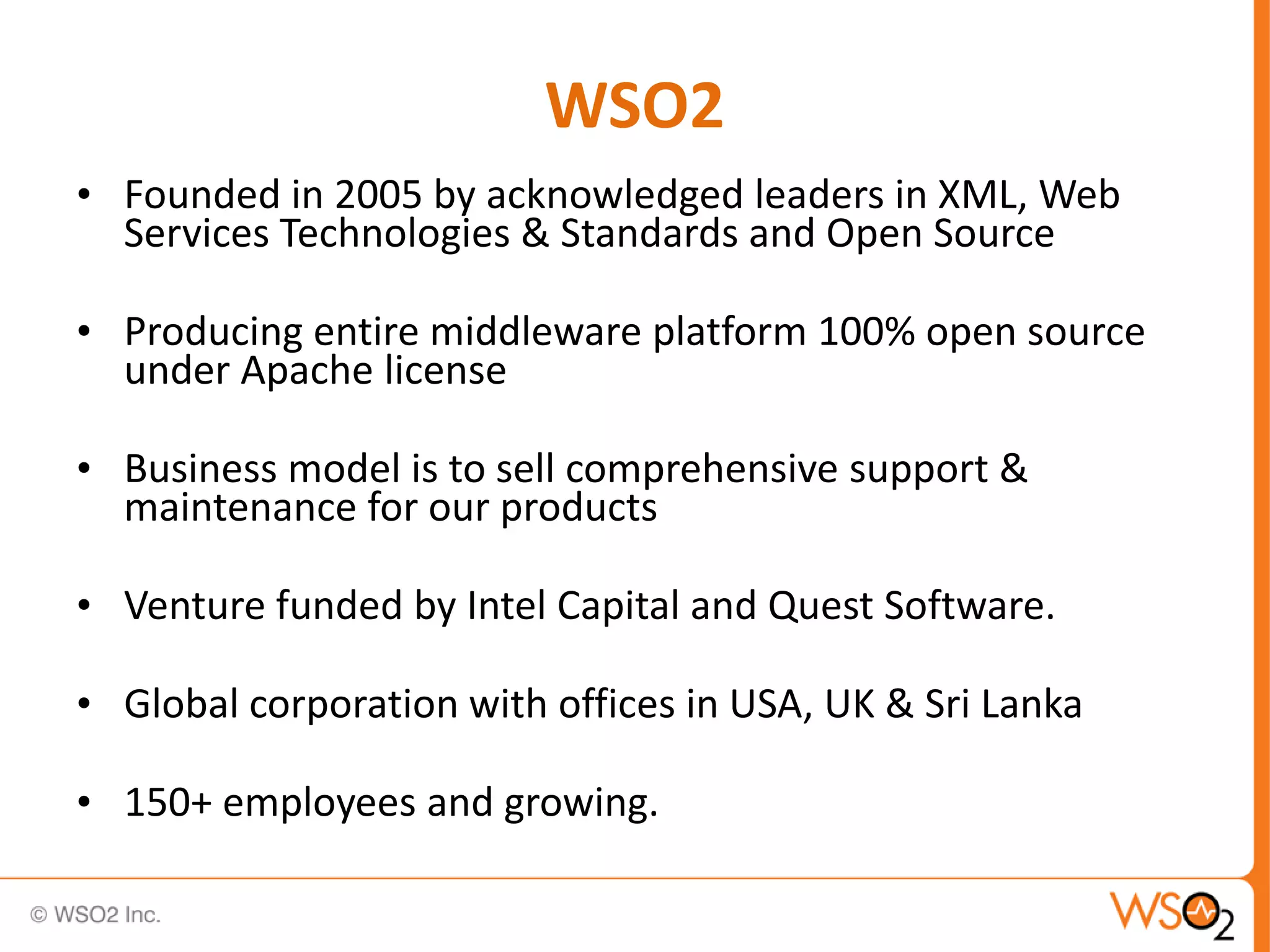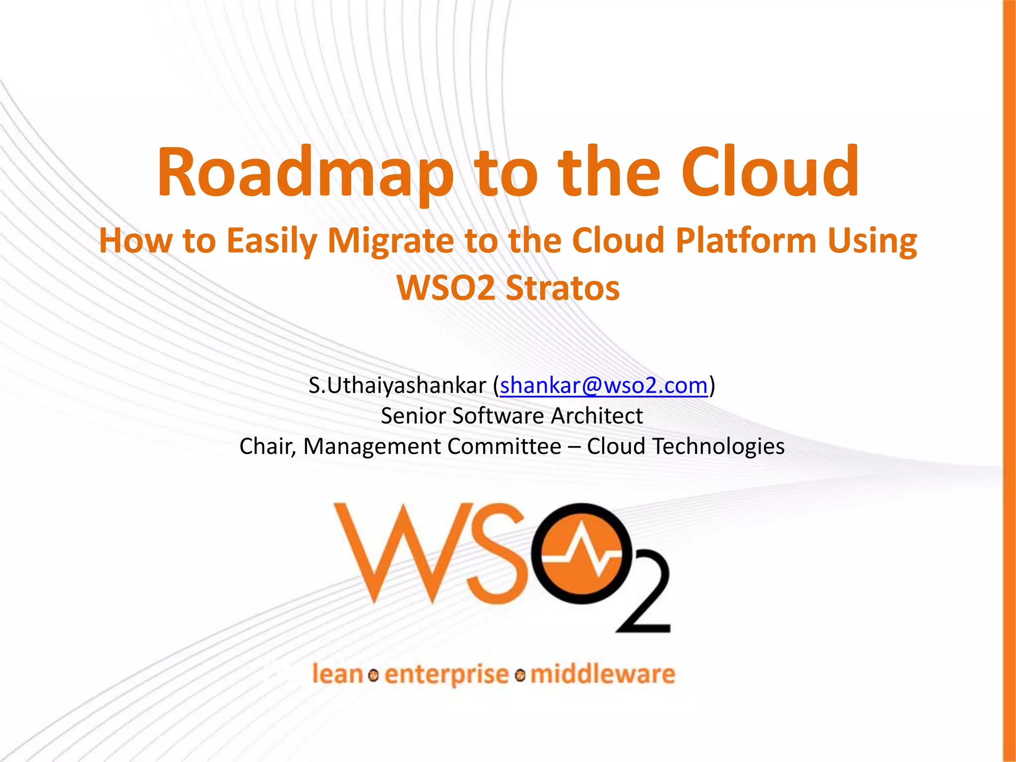 The document provides an overview of WSO2 Stratos, a cloud platform that allows easy migration of applications to the cloud. It discusses cloud computing models and properties of cloud native applications. Stratos is presented as a PaaS that provides shared middleware services, proper tenant isolation, and tools to help move applications to the cloud while supporting industry standards. Key features highlighted include seamless migration from WSO2 Carbon, a polyglot data solution, and developer studio support.